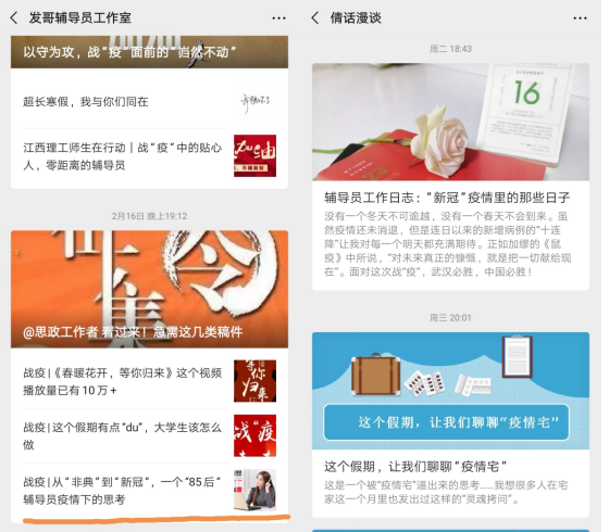 周倩老师先后撰写《数学与统计学院多措并举打好疫情防控“组合拳”》、《同心抗“疫”,数统学子彰显青春担当》等文章,向同学们传递学校声音,增强抗疫信心。她还在个人微信公众号“倩话漫谈”上撰写《疫情期间辅导员致同学们的一封信》、《从“非典”到“新冠”,一个“85后”辅导员疫情下的思考》、《辅导员工作日志:“新冠”疫情里的那些日子》等网文,发布在“高校辅导员联盟”、“发哥辅导员工作室”、“合师青年”等公众号上,传递疫情防控正能量。