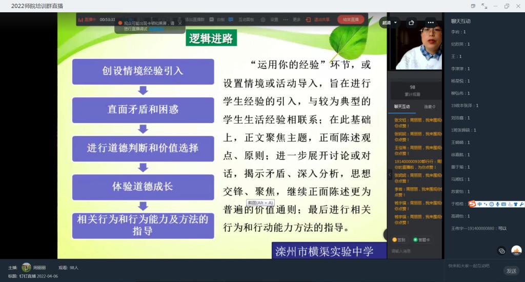 为进一步提高师范生综合素质,切实做好2022年春季学期实习工作,不断提高师范生培养质量。开云kaiyun官方网站于2022年4月6日上午以钉钉直播的方式举办了师范生“名师课堂”首场活动。滦州市横渠实验中学高级教师、唐山市骨干教师周丽丽老师应邀以《<道德与法治>七年级(上)教材解读》为题,为开云kaiyun官方网站2019级思政本科和2020级、2021级公费师范生作了报告。开云kaiyun官方网站胡志洋老师主持活动。