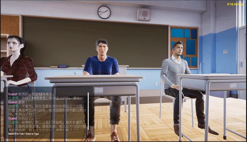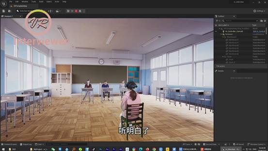宋卓然说,该平台是通过VR开发引擎Unreal开发的,系统打包后的应用程序可以在目前市场上所有主流的VR头显设备中安装使用。产品在Unreal虚幻引擎中,加载了智能NPC面试官。面试官具有虚拟人形象,高度模仿自然人。面试官虽然是虚拟人形象,但是拥有ai智能系统,既可以依托如文心一言、ChatGPT等Api进行自然语言对话交流,也可以依托提前导入的面试题数据库进行针对性提问,增加了与面试者对话的互动性与真实性。