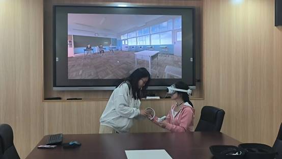 “按住手柄方向键,当圆形光标移动到目标位置后松手,即可瞬间移动到相应地点。”“云面试官”项目团队负责人宋卓然,正在为同学们演示如何进行VR虚拟面试训练。