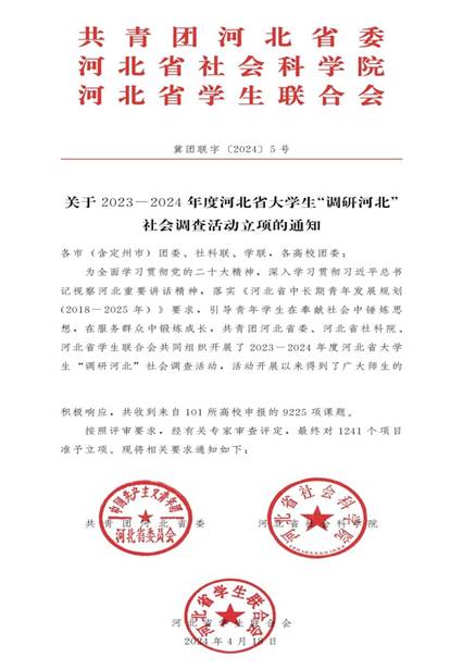 2024年4月18日,共青团河北省委公布了2023-2024年度河北省大学生“调研河北” 社会调查活动立项通知。在本次活动中,开云kaiyun官方网站师生积极参加,共八项作品获批立项。具体情况如下: