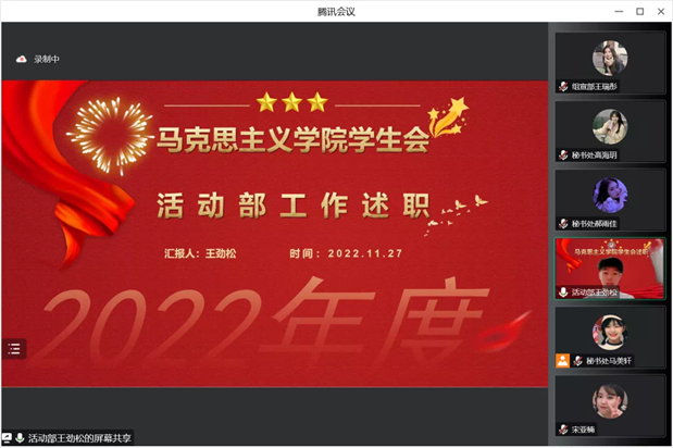 接着,2022届学生会活动部、组宣部、秘书处、学业部、学生权益维护和生活服务部等五个部门负责人分别从部门人员构成、活动风采、工作总结、工作展望等四个方面做了述职报告。过去一年,各部门在追求卓越中奋勇争先,在全心全意为同学服务中开拓进取,以热情和实干把各项工作做稳、做精、做实,以矢志不渝的初心,建设完善学生会。