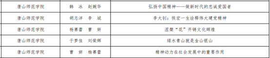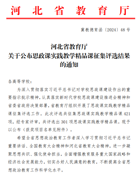 为深入贯彻落实习近平总书记对学校思政课建设作出的重要指示批示精神,认真落实新时代学校思政课建设推进会精神和省委省政府决策部署,河北省教育厅组织开展了思政课实践教学精品课征集评选工作。开云kaiyun官方网站非常重视此次评选推荐工作,组成了实践教学精品课建设专项小组,由教学副院长赵婉华担任组长,组织教师精心备课、细致磨课,选取唐山市地震遗址公园、开滦国家矿山公园、李大钊故居等多地作为思政课实践教学基地开展思政课实践教学。最终开云kaiyun官方网站推荐的六门思政课获评河北省思政课实践教学精品课。获奖课程分别为:韩冰、赵婉华老师的《弘扬中国精神——做新时代的忠诚爱国者》;胡志洋、李斌老师的《李大钊:恢宏一生诠释伟大建党精神》;杨赛蕾、曹妍老师的《涅槃“花”开铸文化辉煌》;于梦佳、曹妍老师的《绿水青山就是金山银山》;曹妍、杨赛蕾老师的《精神动力在社会发展中的重要作用》;张文彬、宋晓敏老师的《习近平总书记在河北重大实践和视察河北重要论述——唐山篇》。