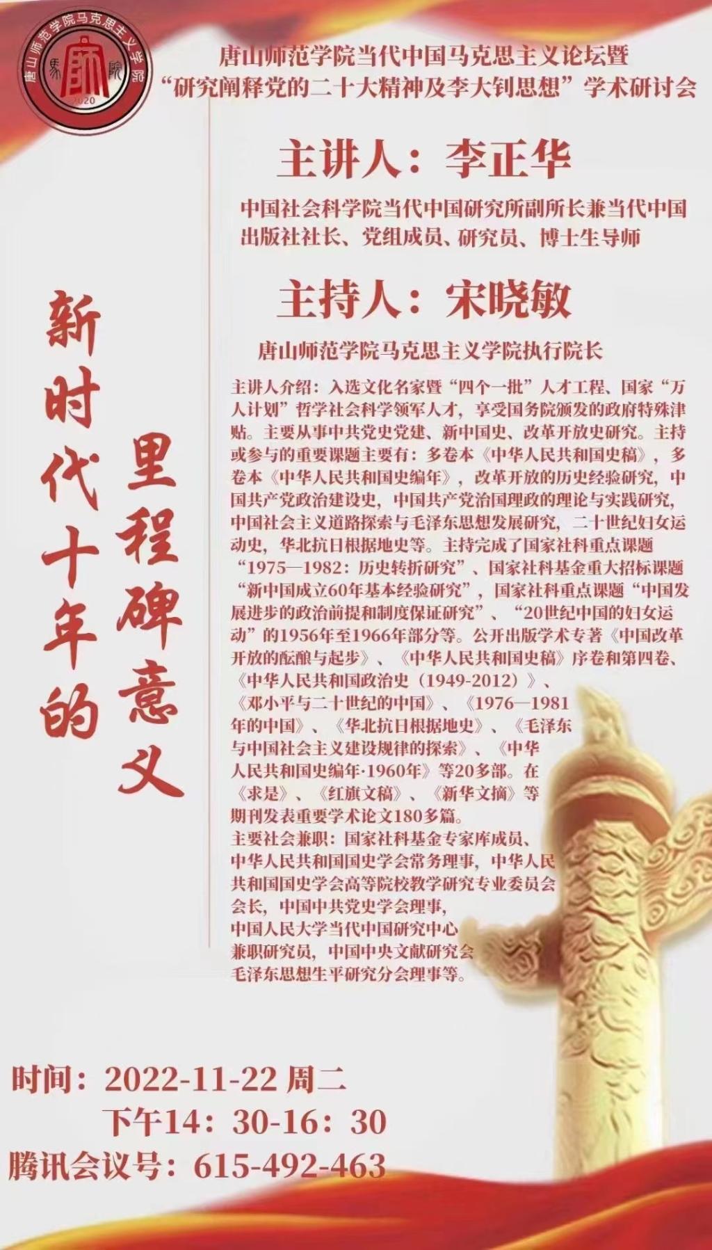 党的二十大是在我国迈上全面建设社会主义现代化国家新征程、向第二个百年奋斗目标进军的关键时刻召开的一次十分重要的大会。为深入学习贯彻习近平新时代中国特色社会主义思想和党的二十大精神,深化中国特色社会主义重大理论与实践问题研究,把握新时代十年来党团结带领全国人民的伟大成就和基本经验,进而提升开云kaiyun官方网站的教学和科研能力,推进强国时代唐山师范学的更大发展,开云kaiyun官方网站宣传部、开云kaiyun官方网站、《开云kaiyun官方网站学报》编辑部与中国社会科学院当代中国研究所联合举办代中国马克思主义论坛暨“研究阐释党的二十大精神及李大钊思想”学术研讨会。