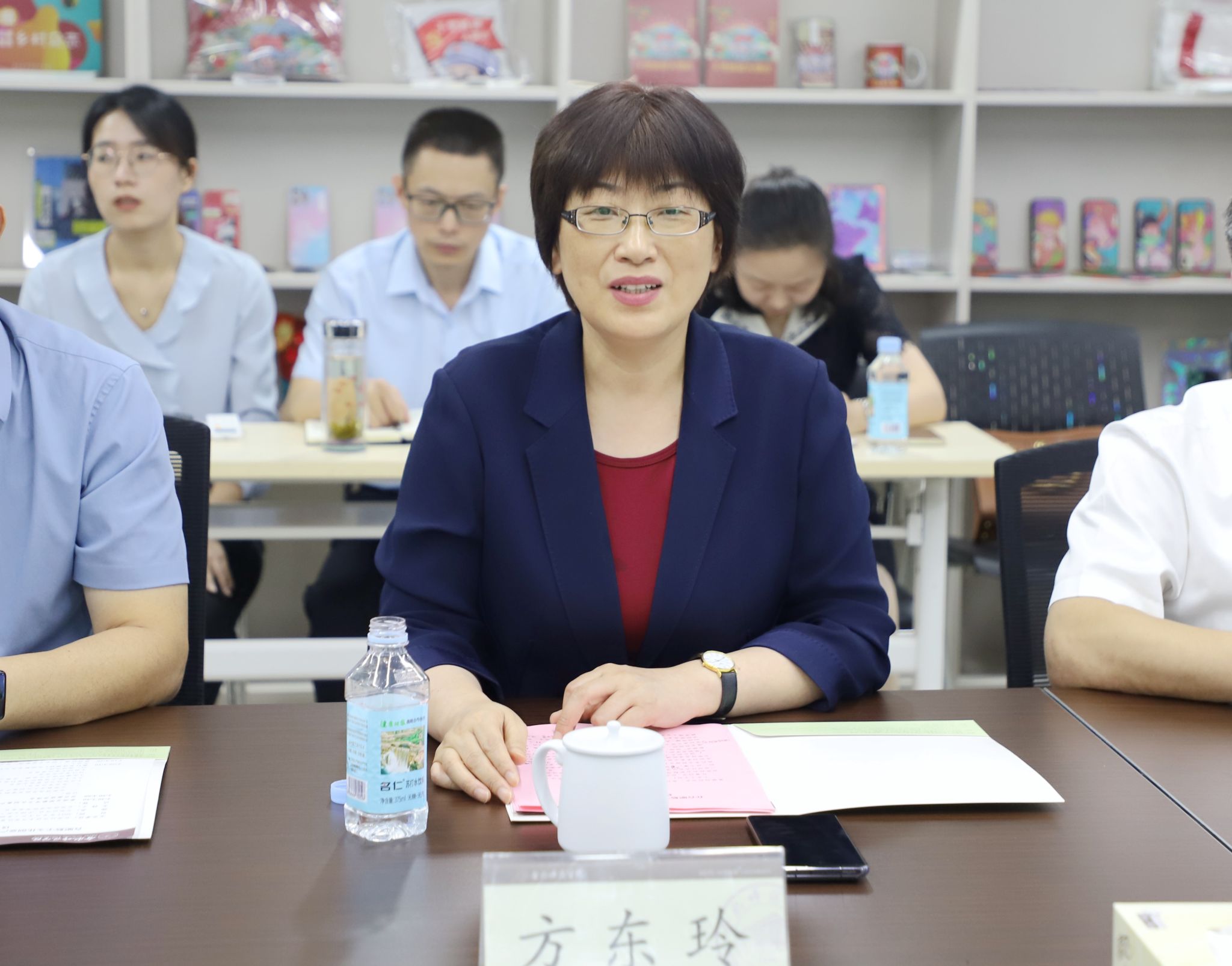 会上,方东玲首先向现场嘉宾简要介绍了学院的基本情况及中心前期筹备和进展情况,代表学院对合肥市人民政府和合肥经开区等在场合作单位长期以来给予的支持与帮助表示衷心地感谢。她指出,中心入驻园区一年以来,在孵化文创企业、参与数字文化创意产品研发、推动成果转化等方面开展了一系列工作,取得了良好的效果。她强调,下一步要通过共建中心,在统筹校内资源上持续发力,充分发挥学院文化产业等学科专业群资源优势,引导师生走出校园,走进社会实践,赋能乡村文化建设和经济社会发展。在整合合肥高校资源上持续发力,依托中心搭建供需合作平台,在人才培养、师资队伍和文化创意服务等领域开展深度合作,形成产教信息融通、资源共享、供需匹配的良性互动格局。在推动文创产业集群发展上持续发力,集聚文创产业企业,组建文创产业联盟,积极联合申报国家级大学生创新创业产业园,努力建设文化产业汇聚地。在培育文创品牌上持续发力,创办或承接市区文创系列活动,打造一批浸润合肥特色、具有强劲竞争力的文创品牌,为合肥打造”文化名城”作出更大贡献。