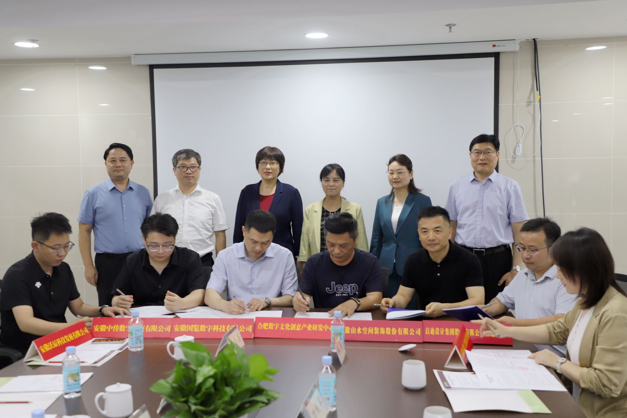 在参会领导的共同见证下,合肥数字文化创意产业研发中心主任分别与安徽环球文化旅游集团、安徽山水空间装饰公司、启迪设计集团合肥分公司、安徽中传数字科技有限公司、安徽沃辰科技发展有限公司、安徽国览数字科技有限公司等6家公司代表,进行现场合作签约。