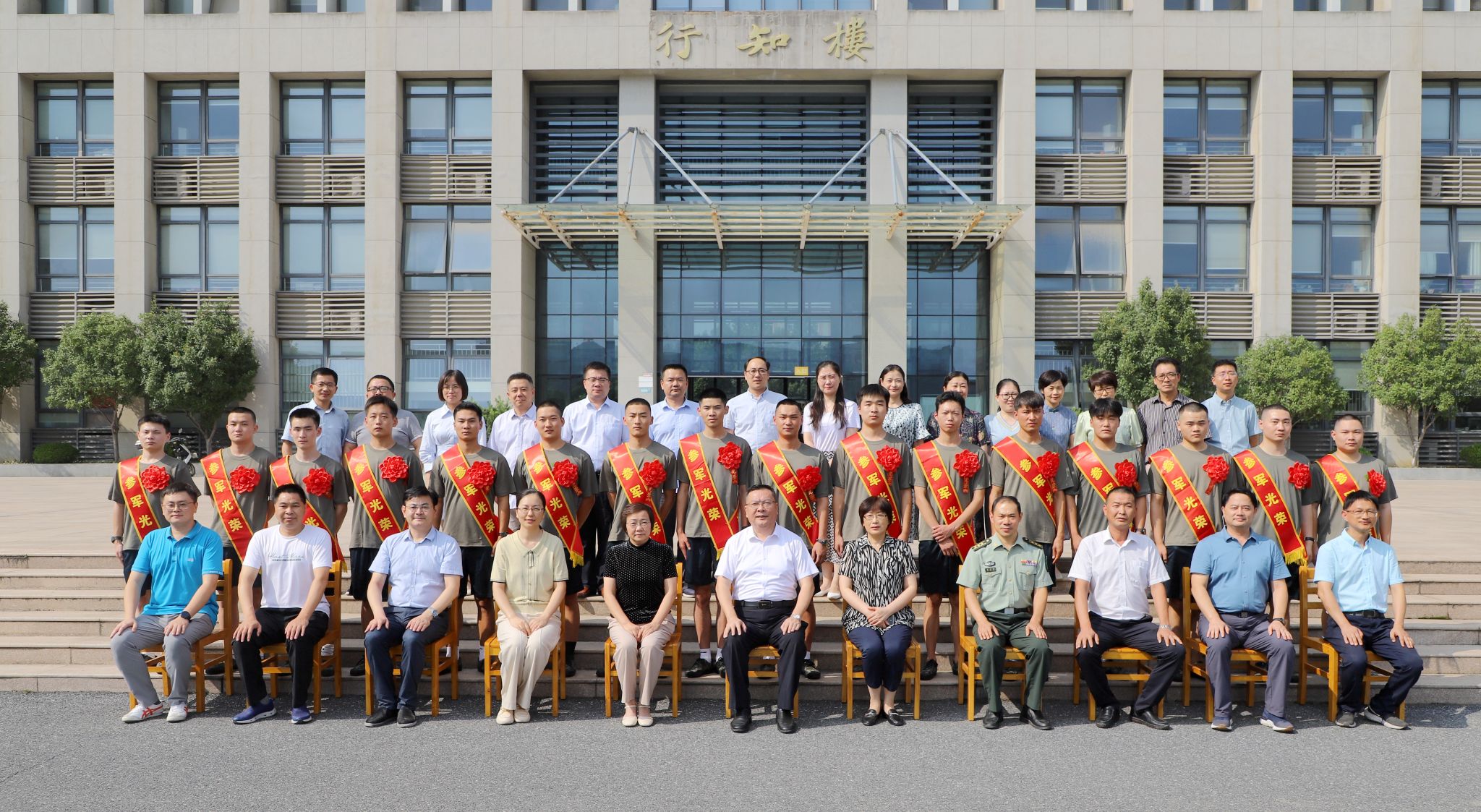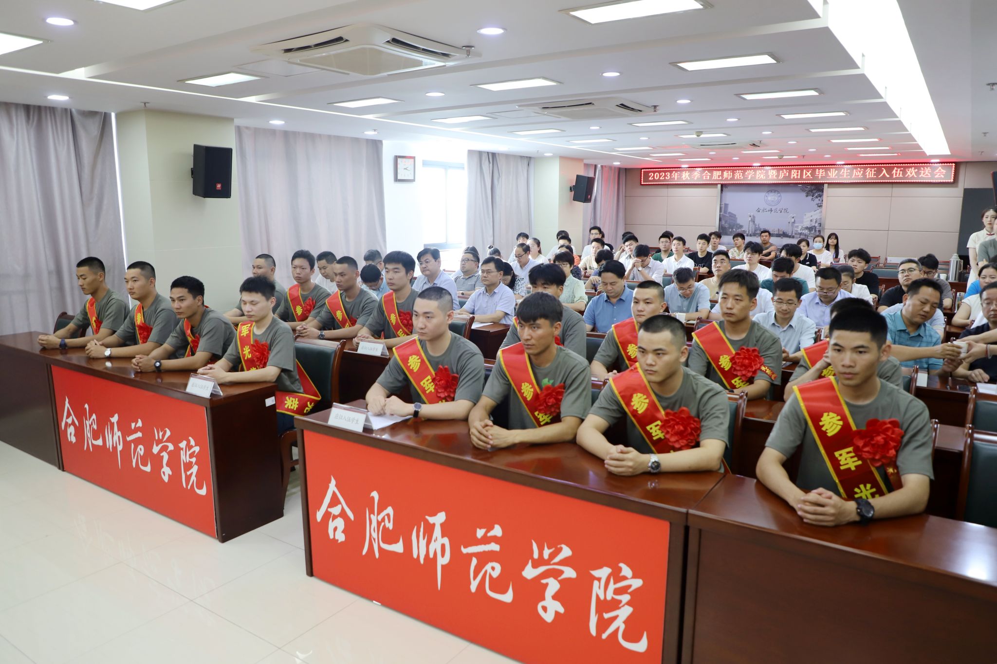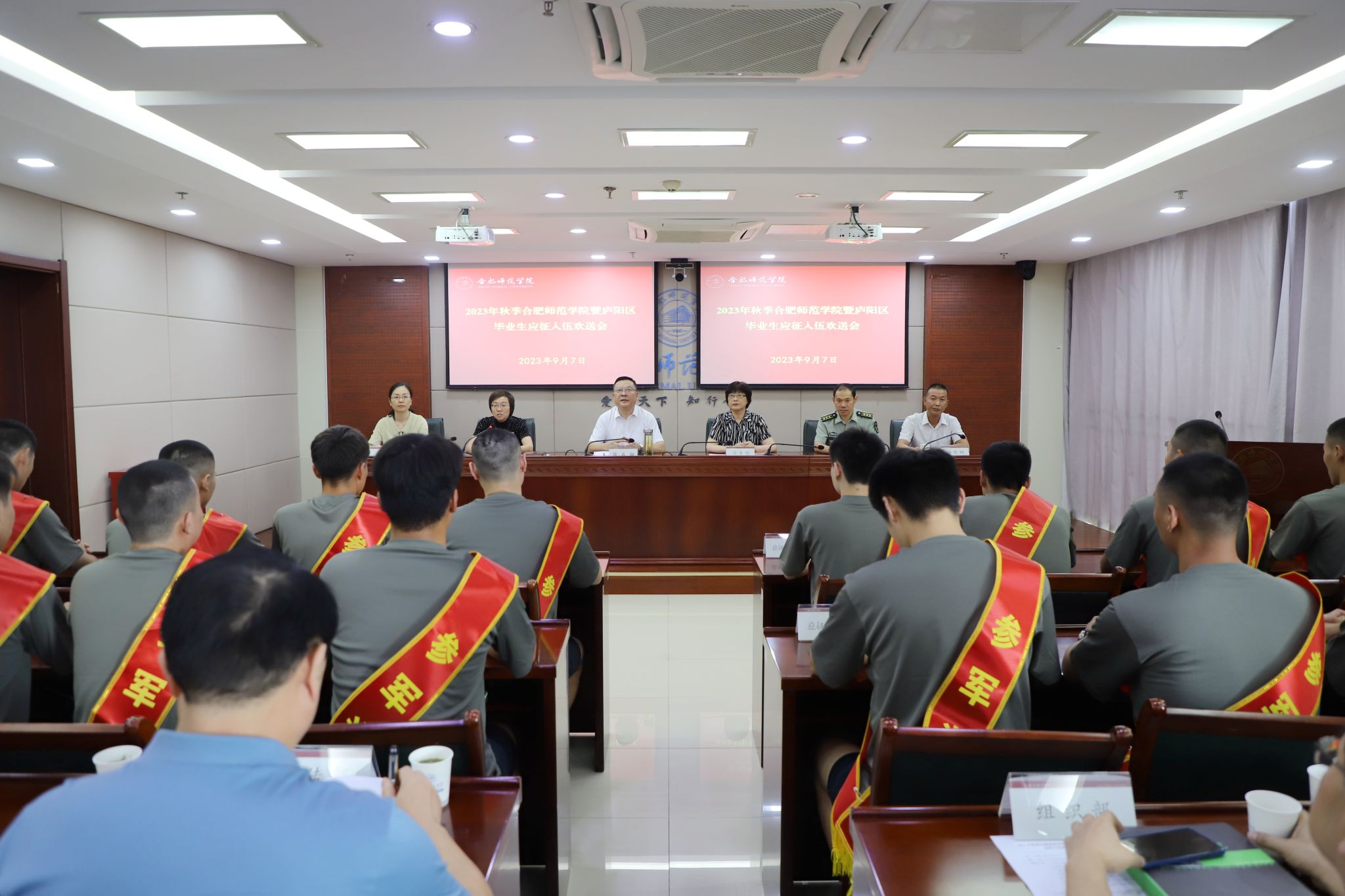 本网讯 9月7日下午,学院2023年秋季应征入伍毕业生欢送会在锦绣校区行知楼举行。院党委书记徐成钢,院党委副书记、院长方东玲,庐阳区人武部部长韩方景,庐阳区三孝口街道党(工)委书记桑田、人武部部长杨敬树,学院征兵工作领导组全体成员、2023届毕业班辅导员及2020级学生代表参加会议。会议由院党委副书记梁立昌主持。