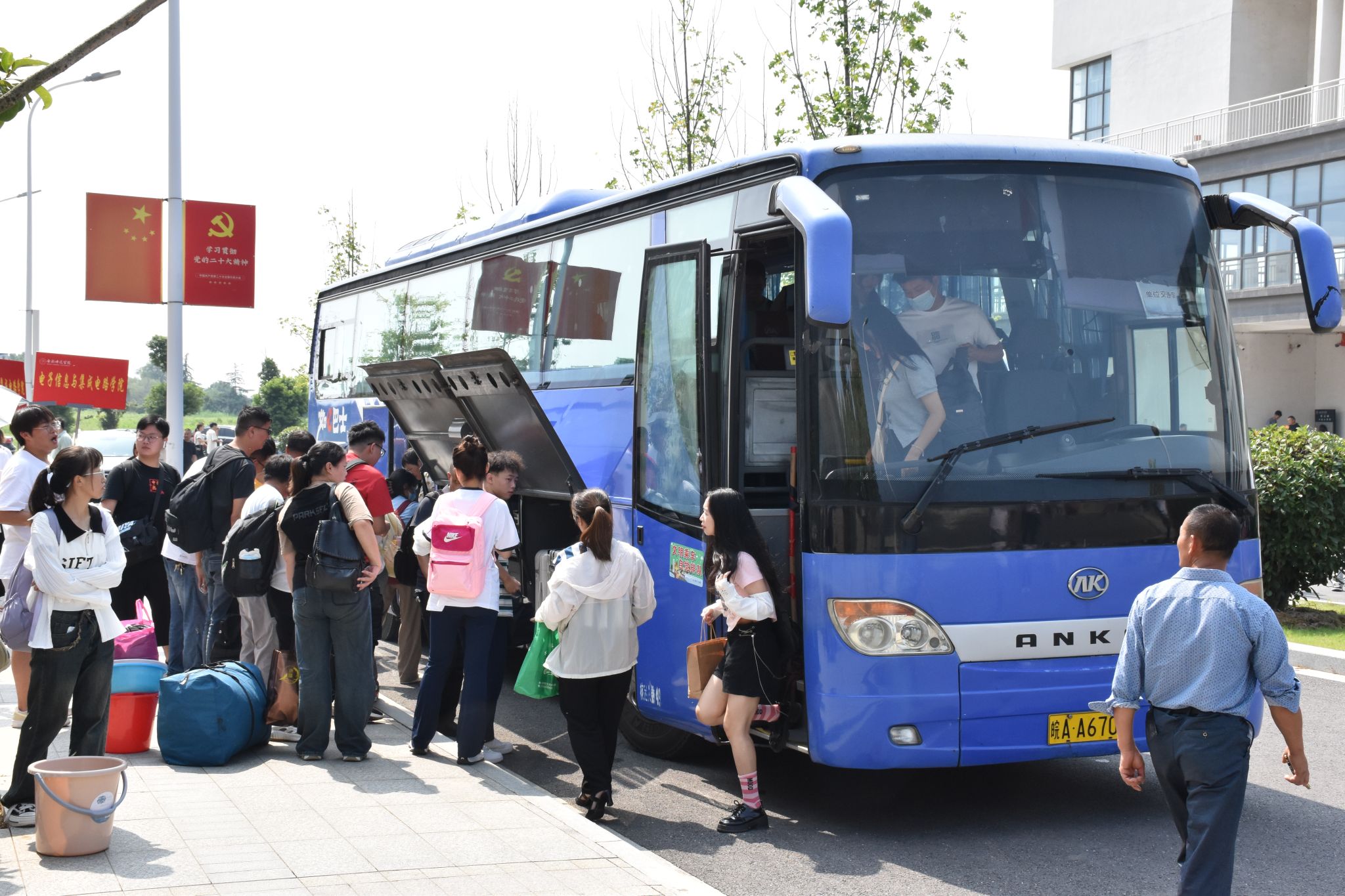 天微微亮,在合肥火车站和合肥南站,由院团委、学生工作部组织的31名接站志愿者们早已在接站处等候。他们身着红色马甲,手举印有“beat365中文官方网站”标识牌,为乘坐铁路交通的新生和家长们提供接站、咨询和送车服务。新生们乘上学校定制的公交专线,待抵达校园后,由校内志愿者完成接驳、搬运行李、引导报道等后续工作。