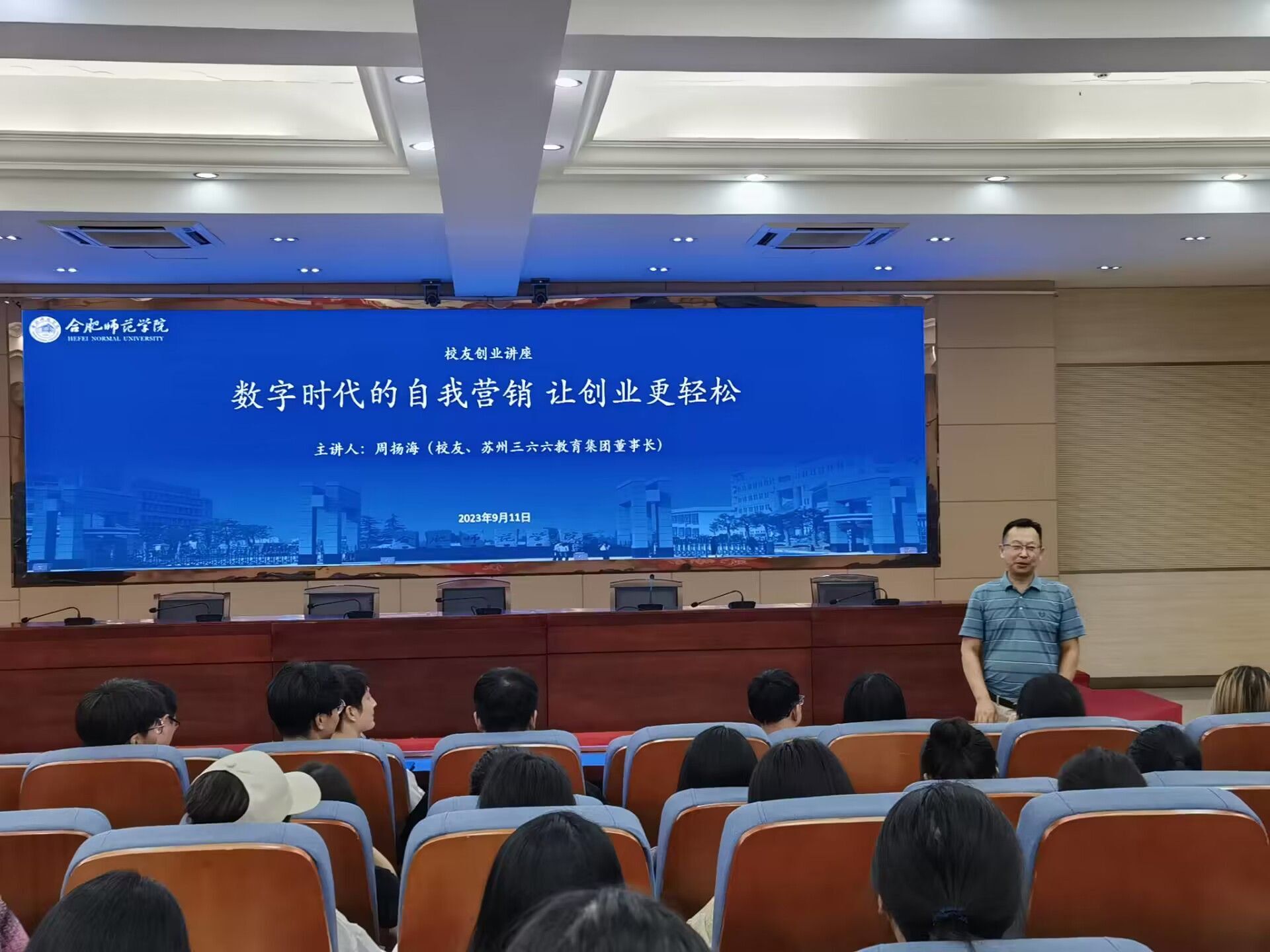 本网讯 为进一步营造浓厚的就业创业氛围,增强就业创业意识,引导学生树立正确的择业观与就业观,9月11日,学院邀请英语专业校友、三六六教育集团董事长周扬海回校作创业讲座。