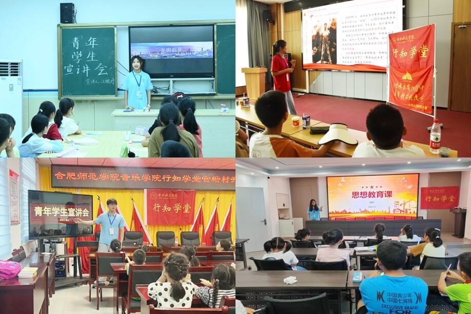 青年学生宣讲团15名宣讲员赴全省各地行知学堂活动场所,面向600余名群众特别是青少年群体开展习近平新时代中国特色社会主义思想“青年化”阐释宣讲。黄山市逐梦赤子行知学堂邀请退伍军人、“中国好人”张志健向小学员讲述自己在服役期间创办“雷锋小分队”,退伍后创办“行益课堂”的故事。合肥市锦绣社区行知学堂“小先生”由学生党员担任,开展“探秘叶子王国的秘密”“收获成长 砥砺前行”等活动,宣传贯彻习近平生态文明思想。合肥琼临行知学堂邀请社区网格党总支的在册党员,向小学员们开展党的二十大精神专题宣讲。黄山风景区行知学堂深入学习领会习近平总书记给安徽黄山风景区工作人员李培生、胡晓春重要回信精神,结合黄山人文底蕴,开设红色文化、启蒙地理和历史探究课程。合肥市云华社区行知学堂依托打造红色影视教育教学模式,组织小学员观看《建党伟业》《建国大业》等红色电影,并解析其中的历史事件和英雄故事。泾县行知学堂“小先生”走访调研当地红色基地,感受泾县浓厚的文化底蕴,举办“红色泾县”主题宣讲活动,并以“用自然的颜色开盲盒”为主题的手工教育扎染活动宣讲中华优秀传统文化。宣城市郎溪县卓尔行知学堂以“七七事变”“八一”建军等事件为主题开展了多次爱国主义教育,并邀请辖区派出所、文化馆等单位联合开展“法治教育”“非遗文化传承”等主题讲座。合肥市紫云行知学堂贯彻落实习近平总书记关于民族团结进步重要论述,吸纳少数民族“小先生”进入团队,在教学活动中融入新疆特色,向小学员介绍少数民族习俗文化。淮南市居南社区行知学堂组织小学员参观大通区文化馆,感受中华民族传统文化和历史遗迹的独特魅力。巢湖市红色筑梦行知学堂联合黄麓镇妇联开展了红色经典朗诵活动,组织小学员讲述英雄故事。