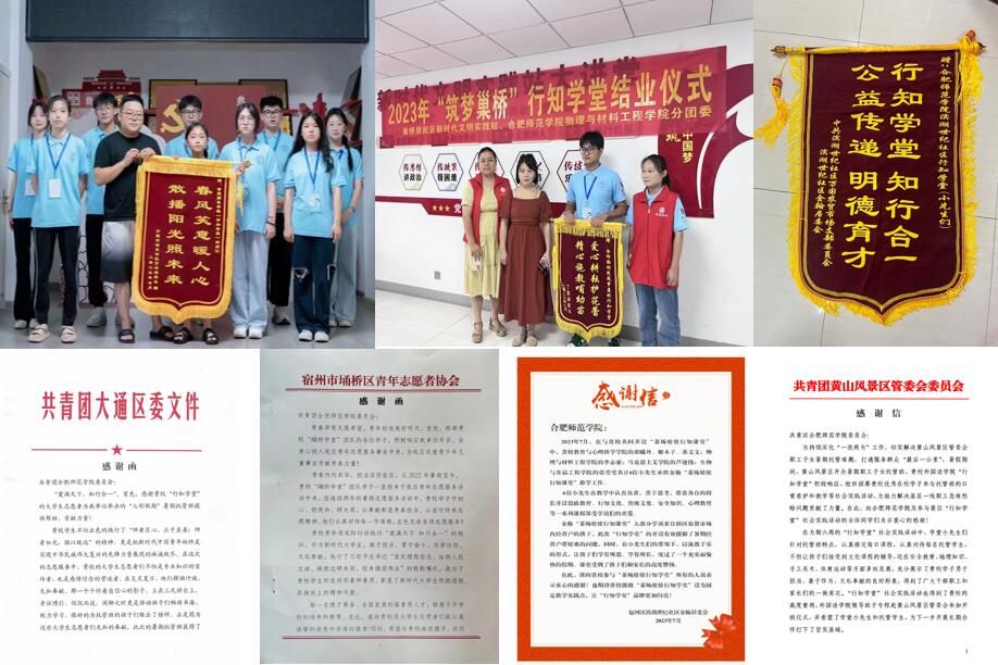 随着“行知学堂”实践活动知名度和影响力进一步发展,吸引了中国海洋大学、西北工业大学、北京交通大学、北京邮电大学、合肥工业大学、华侨大学、安徽大学、安徽师范大学、安徽农业大学等70名外校青年大学生主动参与建设学堂29个,服务农村留守儿童1500余人。今年暑期,学院先后收到淮南市大通区、太湖县、亳州市谯城区、黄山风景区管委会、宿州市埇桥区、合肥市包河区滨湖世纪社区、舒城县百神庙镇官塘村、宁国市城东社区等地方政府、学员家长赠送多个锦旗和感谢信。