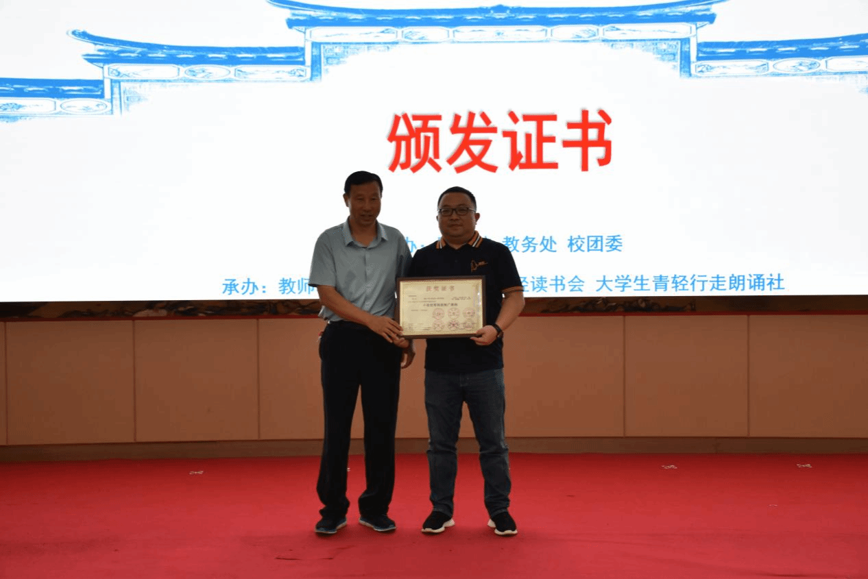 启动仪式上,周经文为我院申报的“阅+历”行知合一述作模式荣获全省第六届校园读书创作活动“十佳优秀阅读推广案例”颁发了获奖证书。张建兵向我院青轻读书会捐赠了300本图书。师生代表现场朗诵了散文《希拉穆仁草原上的守望》《涉故台前》《沁茗书香》等,通过声情并茂的表演体悟文字的力量。