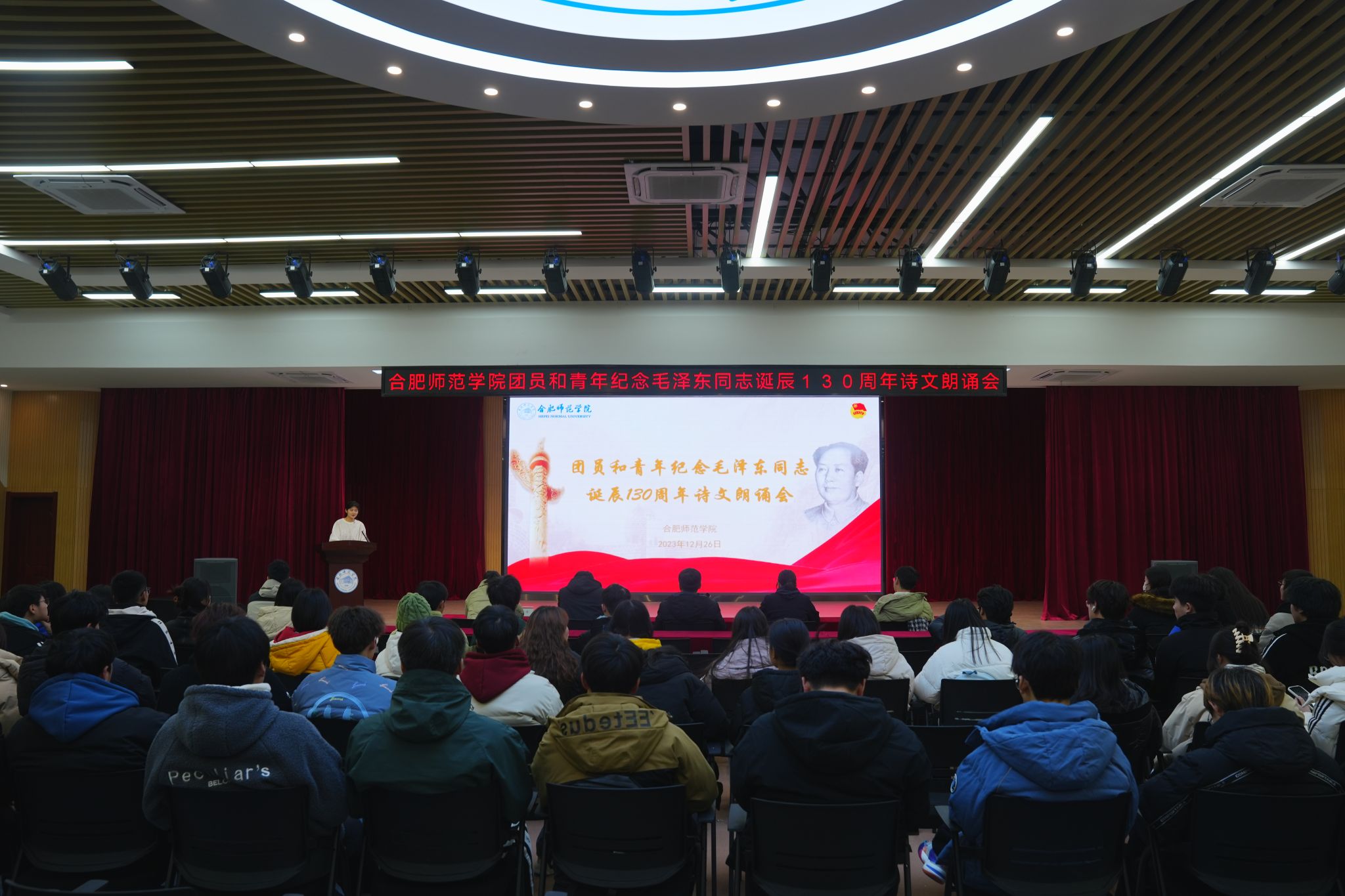 为深切缅怀毛泽东同志,学习毛泽东同志的崇高精神和风范,12月26日中午,学院在锦绣校区大学生活动中心举办团员和青年纪念毛泽东同志诞辰130周年诗文朗诵会。院团委、学生工作部有关教师及学生代表共100余名到场观看。