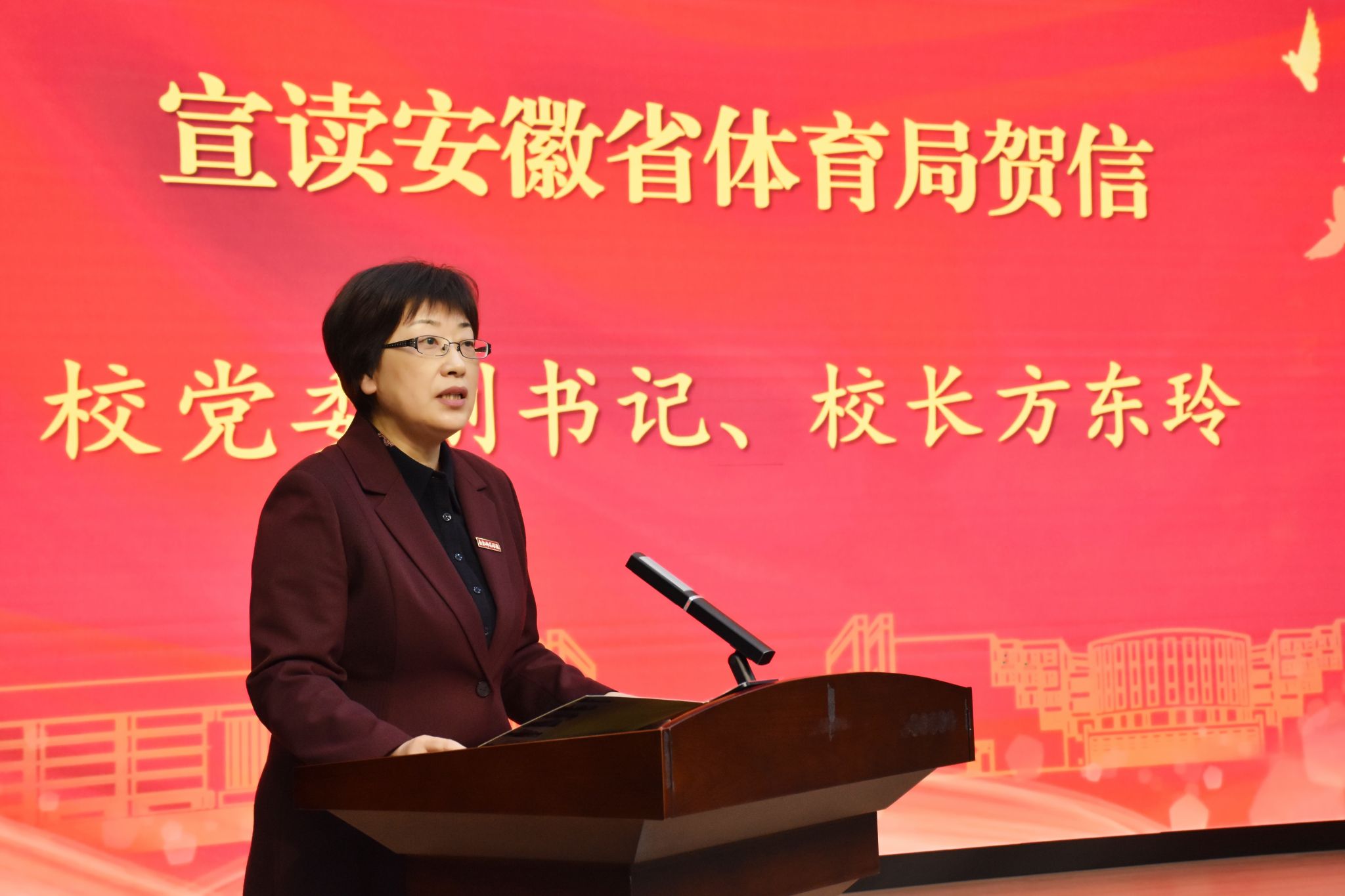 方东玲宣读了安徽省体育局就beat365中文官方网站学子在成都第三十一届世界大学生夏季运动会和杭州第十九届亚洲运动会上摘金夺银、为国争光,取得优异成绩所发来的贺信。