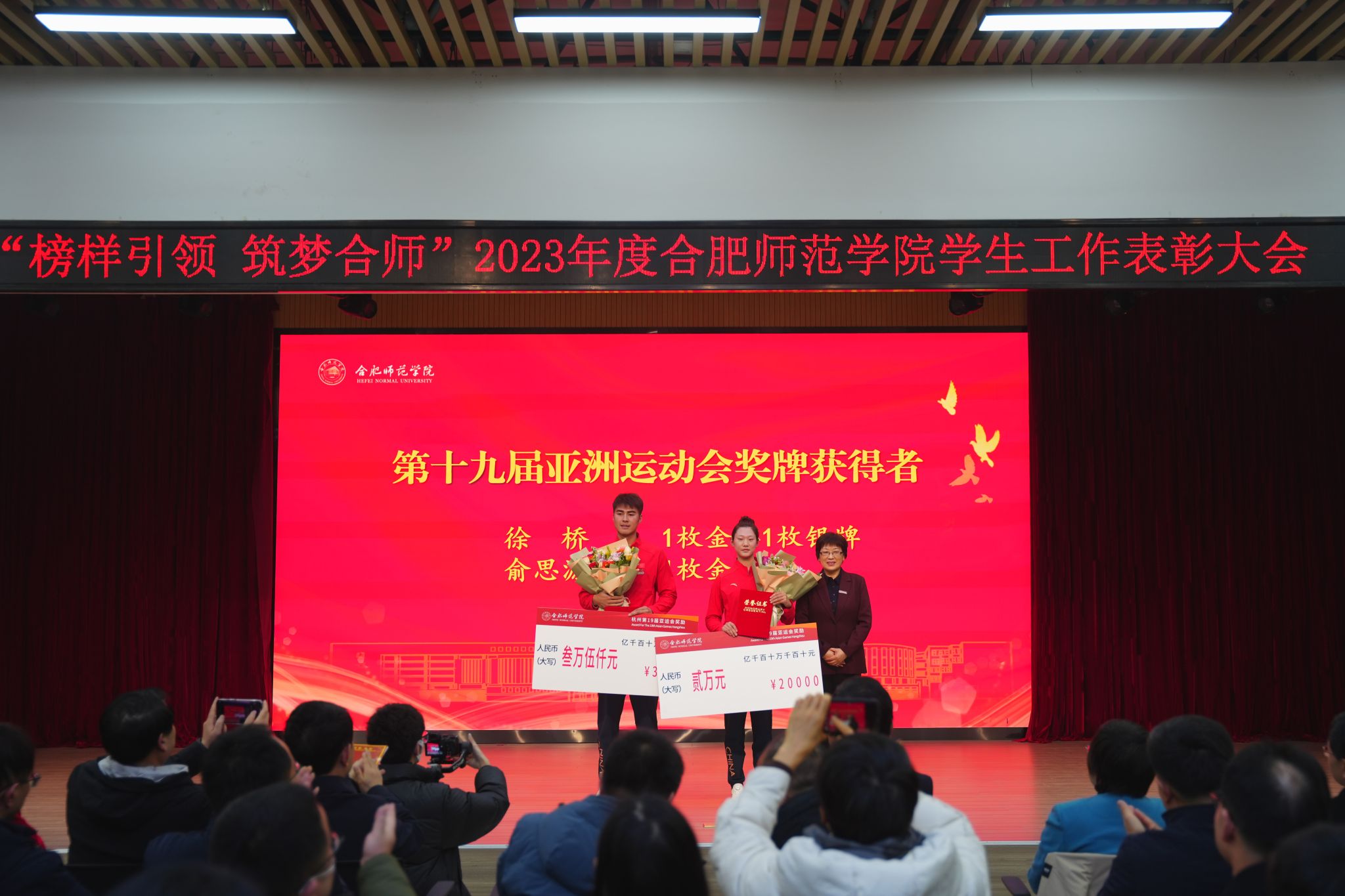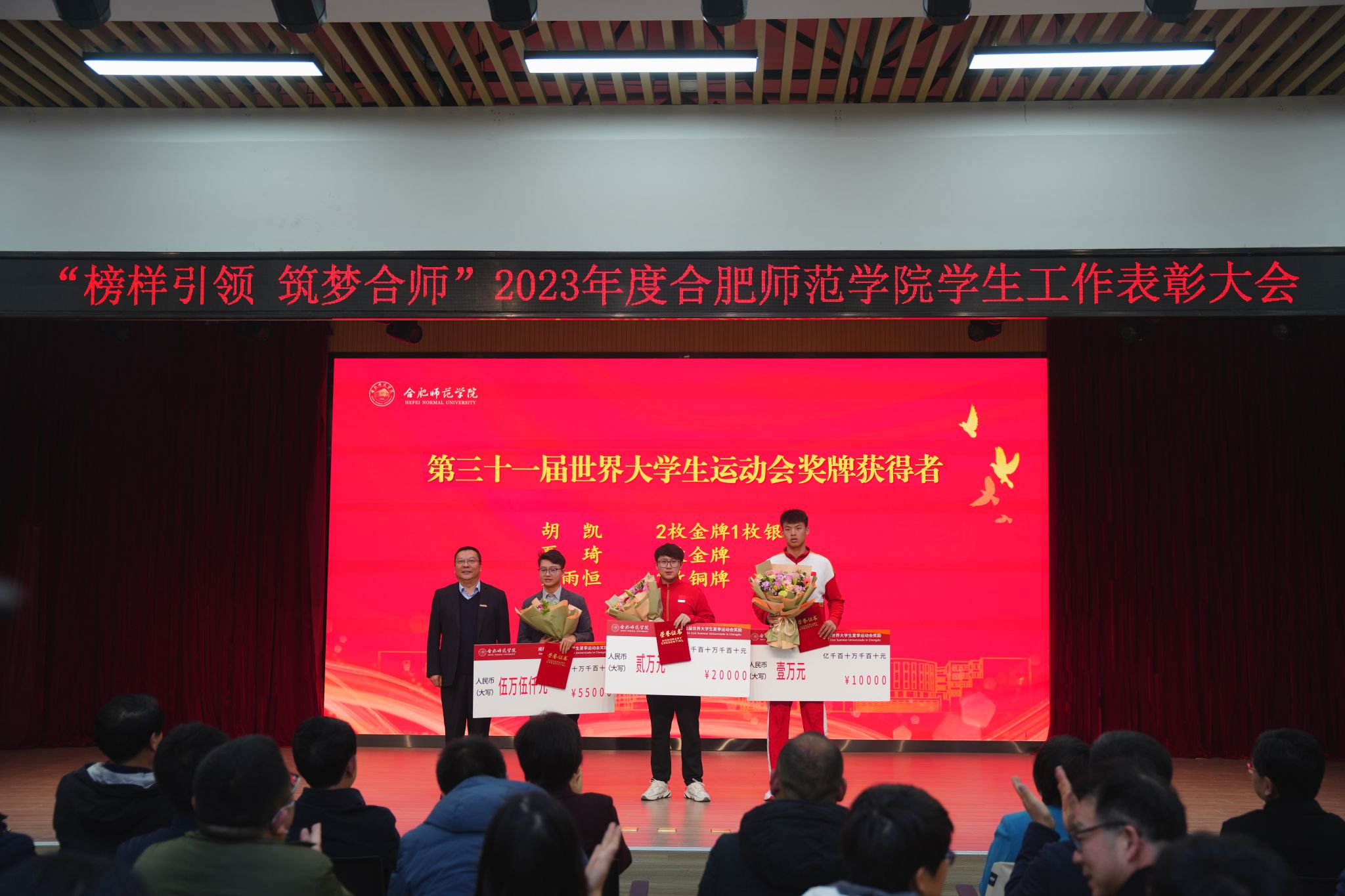 徐成钢为第三十一届世界大学生运动会奖牌获得者颁奖,方东玲为第十九届亚洲运动会奖牌获得者颁奖,梁立昌为2023年度安徽省辅导员年度人物、安徽省大学生年度人物获奖者及国家奖学金、国家励志奖学金获奖者代表颁奖,徐文林为入选安徽省纪委监委第三届“廉洁文化精品工程库”作品创作者颁奖,赵帮恚为学院2022年度优秀辅导员颁奖,常树宝为学院2023年廉洁文化作品征集活动优秀组织奖颁奖。现场还为学院2023年度廉洁文化作品征集活动获奖师生,2023年度十佳优良学风班级、十佳优良学风宿舍、十佳优良学风个人,第二十八届大学生科技文化艺术节优秀组织奖、组织奖和“十佳活动”进行了颁奖。