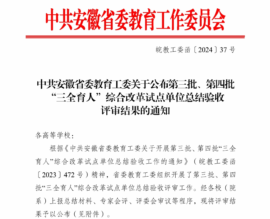 近日,省委教育工委发布《中共安徽省委教育工委关于公布第三批、第四批“三全育人”综合改革试点单位总结验收评审结果的通知》(皖教工委函〔2024〕37号),beat365官网作为安徽省第三批“三全育人”综合改革试点高校,数学与统计学院、生物与食品工程学院作为第三批试点院系,均顺利通过总结验收。