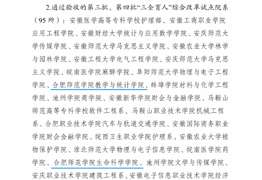 自获批“三全育人”综合改革试点高校以来,学校党委高度重视,成立由学校党政主要负责人为双组长的“三全育人”综合改革试点工作领导小组,对标建设标准,制定工作方案和相关配套实施细则,全面统筹办学治校各领域育人资源和力量,形成了党委统一领导、部门分工负责、院系组织落实、全员协同参与的责任体系。课程育人全面推进。完成“三个一百”课程思政专项建设计划,学校获批安徽省课程思政先行高校、省级教学团队和教学名师各2人,不断深化思政课改革创新,成立全省首个“合肥地区大中小学思政课一体化建设备课联盟”。科研育人着力加强。依托省、校平台,搭建“电子信息系统仿真设计省重点实验室”“青少年心理健康与危机智能干预省社科重点实验室”等省级科研平台14个。实践育人成果丰硕。建设省级创新创业学院,学院连续四年荣获全省职业规划大赛一等奖。开办特色实践活动“行知学堂”,服务留守儿童,获评中国青年志愿服务项目大赛金奖等国家级荣誉。文化育人特色鲜明。连续举办28届大学生科技文化艺术节,连续举办16届“感动合师”十大青年学生评选活动,在时间积淀中不断擦亮校园文化品牌。网络育人亮点纷呈。升级校园网主页,策划《三全育人进行时:师者说•同学谈》《致敬吾师》等专栏,加强全媒体中心建设,培育网络名师,精心搭建网络育人平台。心理育人大力促进。建立四级心理危机干预体系,开展“一院一品”等心理健康品牌项目创建,《心理学》课程入选国家级一流课程,23年5月省心理健康平台正式运行。管理育人扎实推动。强化顶层设计、运行机制和队伍建设,在领导带头中大力倡导育人之风,在规章制度中精准体现育人优先,在管理服务中积极落实育人使命。服务育人不断深化。“一分钱早餐”活动被国家级媒体多次报道,“一站式”学生社区打通育人“最后一公里”,“智慧校园”综合系统持续完善,信息化服务师生效能显著提升。资助育人精准推进。创新资助育人形式,开通“绿色通道”,开展诚信感恩主题教育、“出彩合师”等励志典型宣传,落细落实工作体系。组织育人不断优化。学校获批全国高校样板党支部,首批全省高校“双带头人”教师党支部书记工作室。