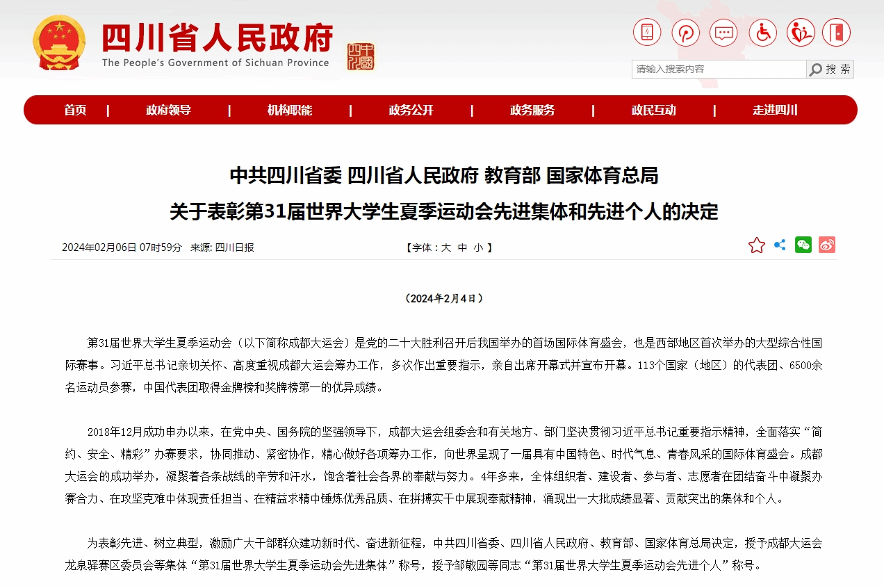 为表彰先进、树立典型,激励广大干部群众奋进新征程、建功新时代。2月4日,中共四川省委、四川省人民政府、教育部、国家体育总局联合印发《关于表彰第31届世界大学生夏季运动会先进集体和先进个人的决定》,beat365官网体育科学学院荣获“第31届世界大学生夏季运动会先进集体”,2021级体能训练专业胡凯被授予“第31届世界大学生夏季运动会先进个人”称号。