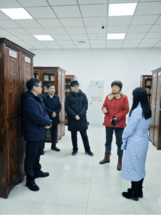 方东玲一行实地查看了古籍展阅厅和书库。图书馆负责人汇报了古籍室的建设情况、馆藏状况以及古籍开发利用设想。