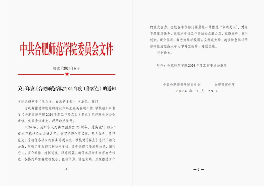 2月29日,学院党委、行政联合印发《beat365中文官方网站2024年度工作要点》(以下简称《要点》)。《要点》指出,2024年是中华人民共和国成立75周年,是实现“十四五”规划目标任务的攻坚之年。学院工作的总体思路是:坚持以习近平新时代中国特色社会主义思想为指导,全面贯彻落实党的二十大和二十届二中全会精神,认真贯彻落实习近平总书记关于教育的重要论述以及省委、省政府决策部署,完整准确全面贯彻新发展理念,强化责任担当、深化作风建设,敢于拉高标杆、勇于攻坚克难,以全面从严治党为保障,聚焦落实立德树人根本任务,重点突出内涵建设和综合改革,一体推进“申报硕士学位授予单位与创建合肥师范大学”。
