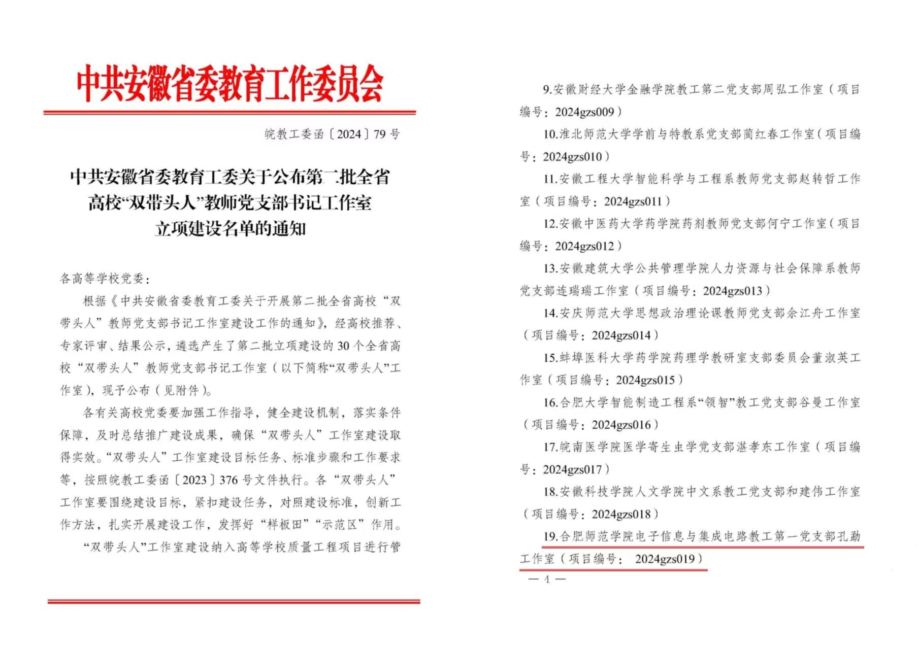 近日,中共安徽省委教育工委发布《关于公布第二批全省高校“双带头人”教师党支部书记工作室立项建设名单的通知》,遴选建设全省高校30个“双带头人”教师党支部书记工作室,beat365官网电子信息与集成电路学院教工第一党支部孔勐工作室获批立项建设。