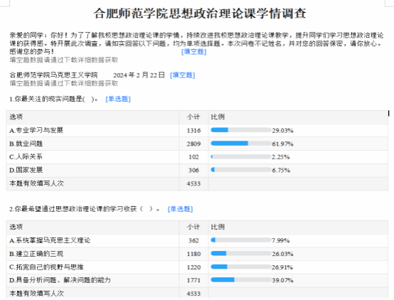 五年来,学院坚持问题导向,开展广泛的学生需求调查。“没有调查就没有发言权”,坚持一切从实际出发,是学院竭力办好思政课,开展有效改革创新的出发点和落脚点。学院充分利用学生座谈会、“师生连心册”等调查机制,收集学生对于思政课教学的意见或建议;借助“学习通”平台,围绕大学生关注的现实问题、思政课学习问题与教学方法问题等开展广泛的需求调查,力求在充分了解学生需求的基础上,不断加强思政课教学的针对性,提高教学实效性。广泛的学生需求调查为深化思政课教学改革,促进教学质量提升,保障学生学有所获、学有所得提供了保障。