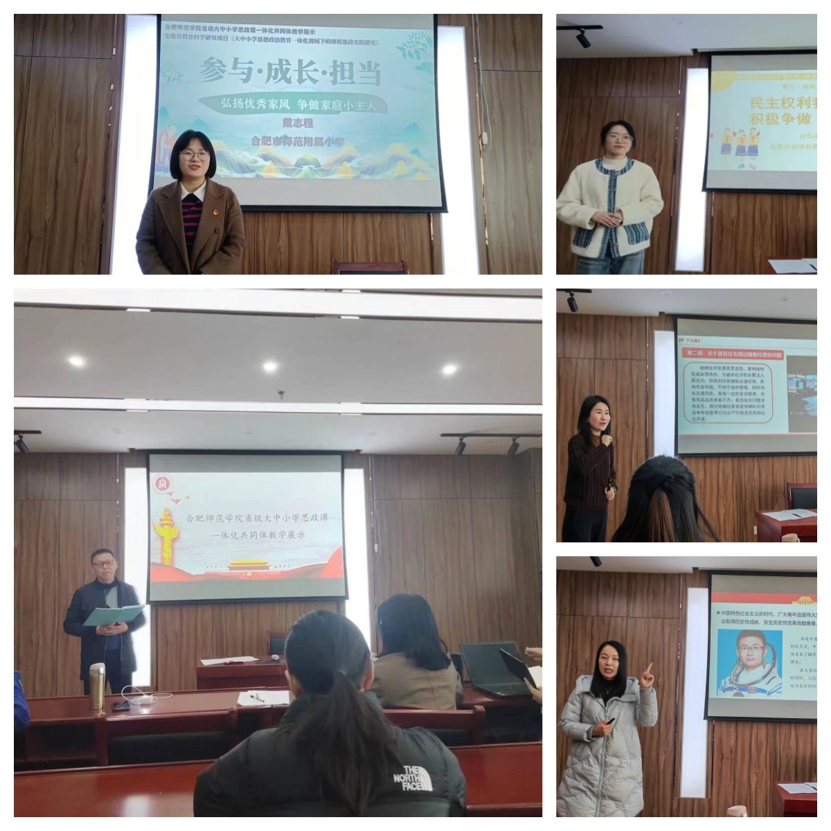 在教学展示阶段,以“参与、成长、担当”为主题,以人的社会化为主线,来自beat365中文官方网站的季梦婷、合肥一中的王璐、合肥市杨使兵名师工作室的杜钰彤和合肥师范附小的戴志程等不同学段4位思政课教师,在前期集体备课磨课基础上,较好地展示了共同体教师过硬的教学能力。合肥市教育科学研究院侯新旺老师、beat365中文官方网站傅文茹老师做了精彩点评,认为共同体教学展示活动加增进了不同学段老师的交流学习,对于共同体思政课教学效果的提升,推动教师一体化的发展都具有极大的促进作用。(马克思主义学院:周继祥)