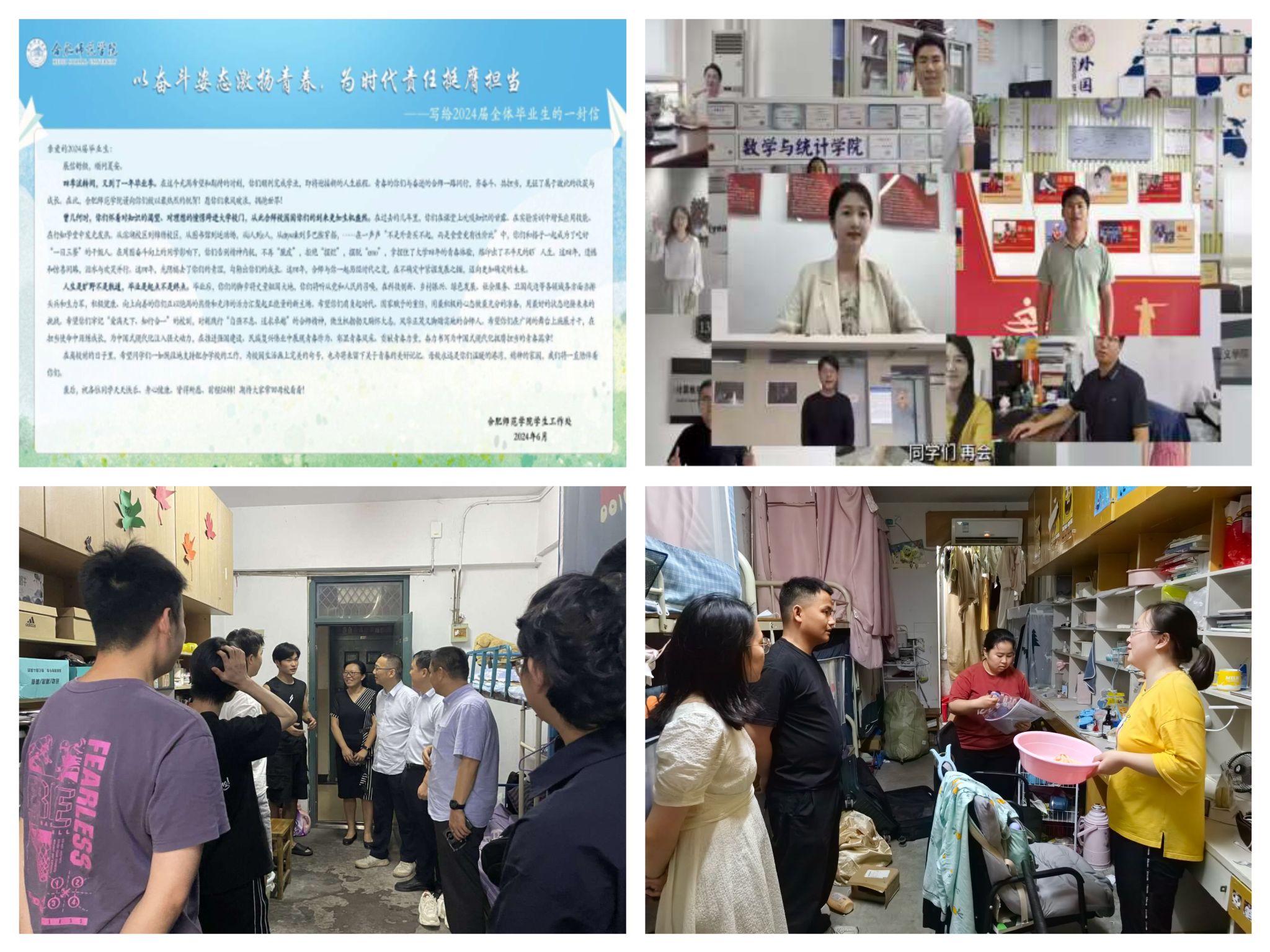 学院开展毕业生文明离校专题教育,重点围绕理想信念、诚信感恩、法治安全、就业创业、心理健康等方面教育,引导毕业生坚定与时代主题同心同向的理想信念,勇担时代使命和历史责任。学生工作处撰写《致2024届全体毕业生的一封信》,勉励同学们肩负起时代、国家赋予的重任,用最好的状态迎接未来的挑战;组织全体毕业班辅导员录制毕业寄语微视频,表达对毕业生的依依不舍之情与殷切期望。各二级学院精心谋划,组织召开毕业生座谈会、深入走访宿舍,帮助毕业生认真分析当前就业形势,及时掌握思想动态,在全校师生的共同努力下营造出了爱校荣校、感恩祝福、快乐祥和的离校氛围。