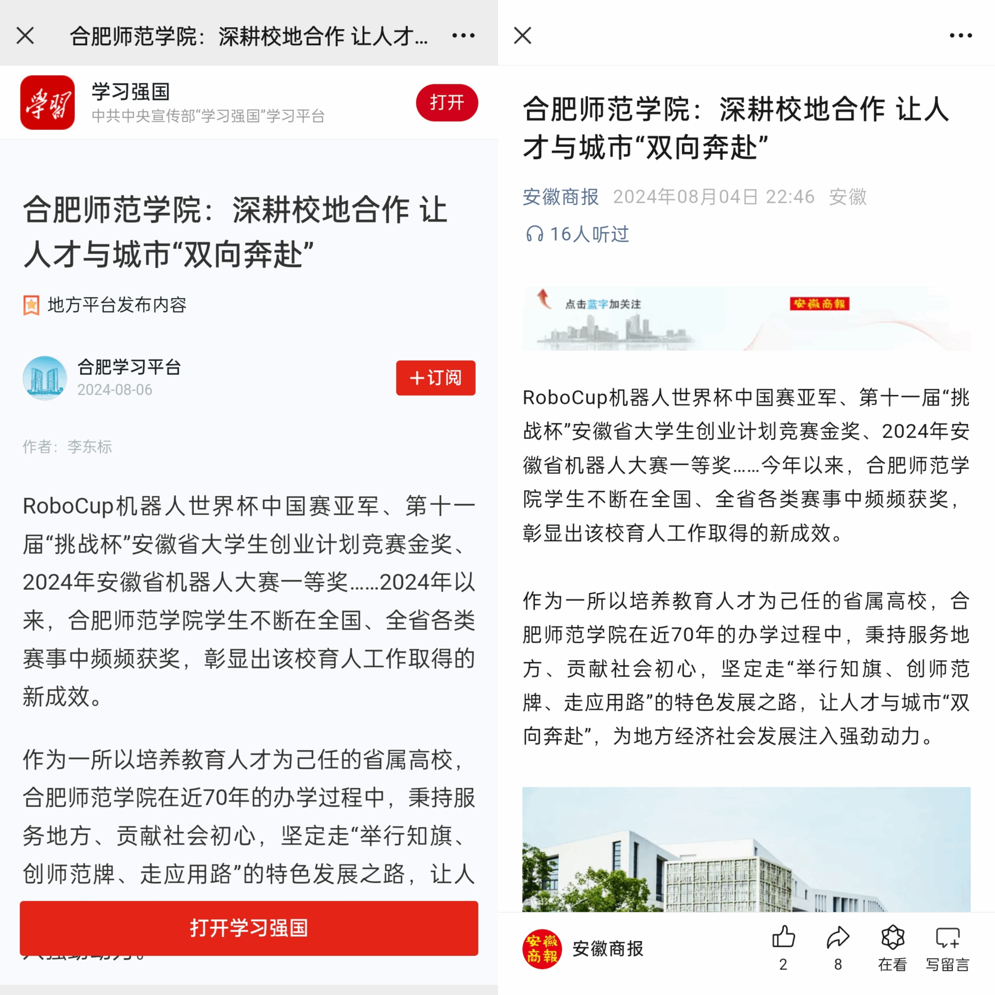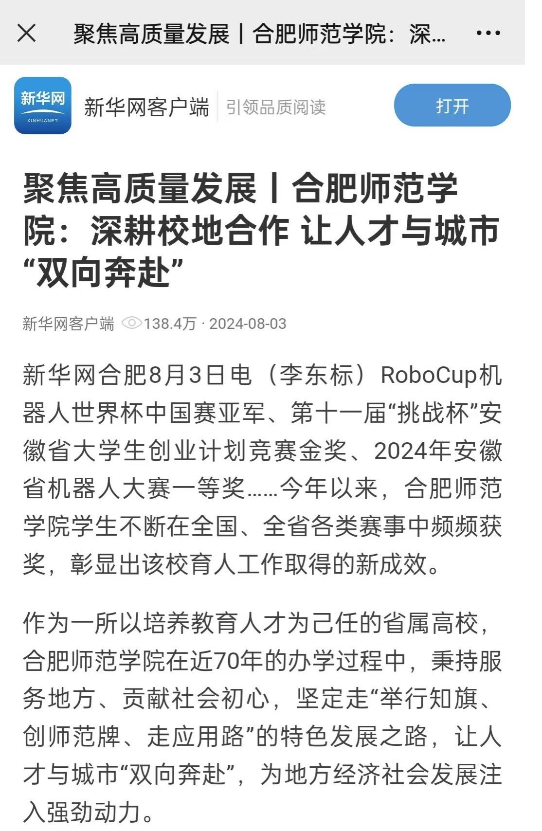 近日,新华网首页、新华网客户端以《聚焦高质量发展丨beat365中文官方网站:深耕校地合作 让人才与城市“双向奔赴”》为题专题报道了beat365官网深耕校地合作,深化基础教育合作,服务地方产业发展的重要举措及成效,总浏览量200万余次。学习强国、安徽商报等进行了转载。(宣传部)