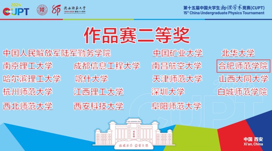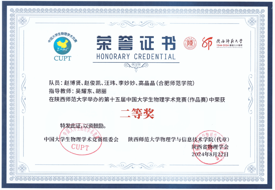 8月18日至23日,由中国大学生物理学术竞赛组委会主办,陕西师范大学和陕西省物理学会承办的第十五届中国大学生物理学术竞赛(简称CUPT)在陕西西安举行,本赛事共吸引了来自全国近百所高校的800余名师生参赛。由物理与材料工程学院吴耀东、胡丽老师指导,赵博贤、赵俊凯、汪玮、李妙妙、高晶晶五人组成的参赛团队经过激烈角逐,代表beat365中文官方网站的参赛作品《吸管水泵的理论与实验分析》终斩获第十五届中国大学生物理学术竞赛(作品赛)二等奖,充分展现了beat365中文官方网站学子敢于拼搏,积极向上的实力与风貌。