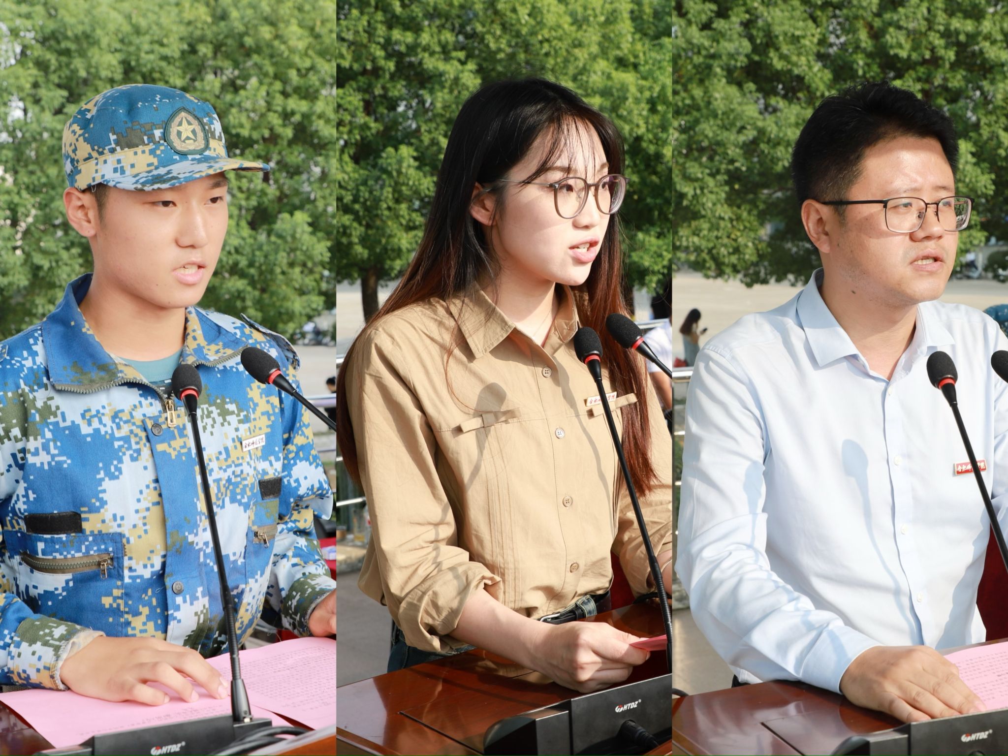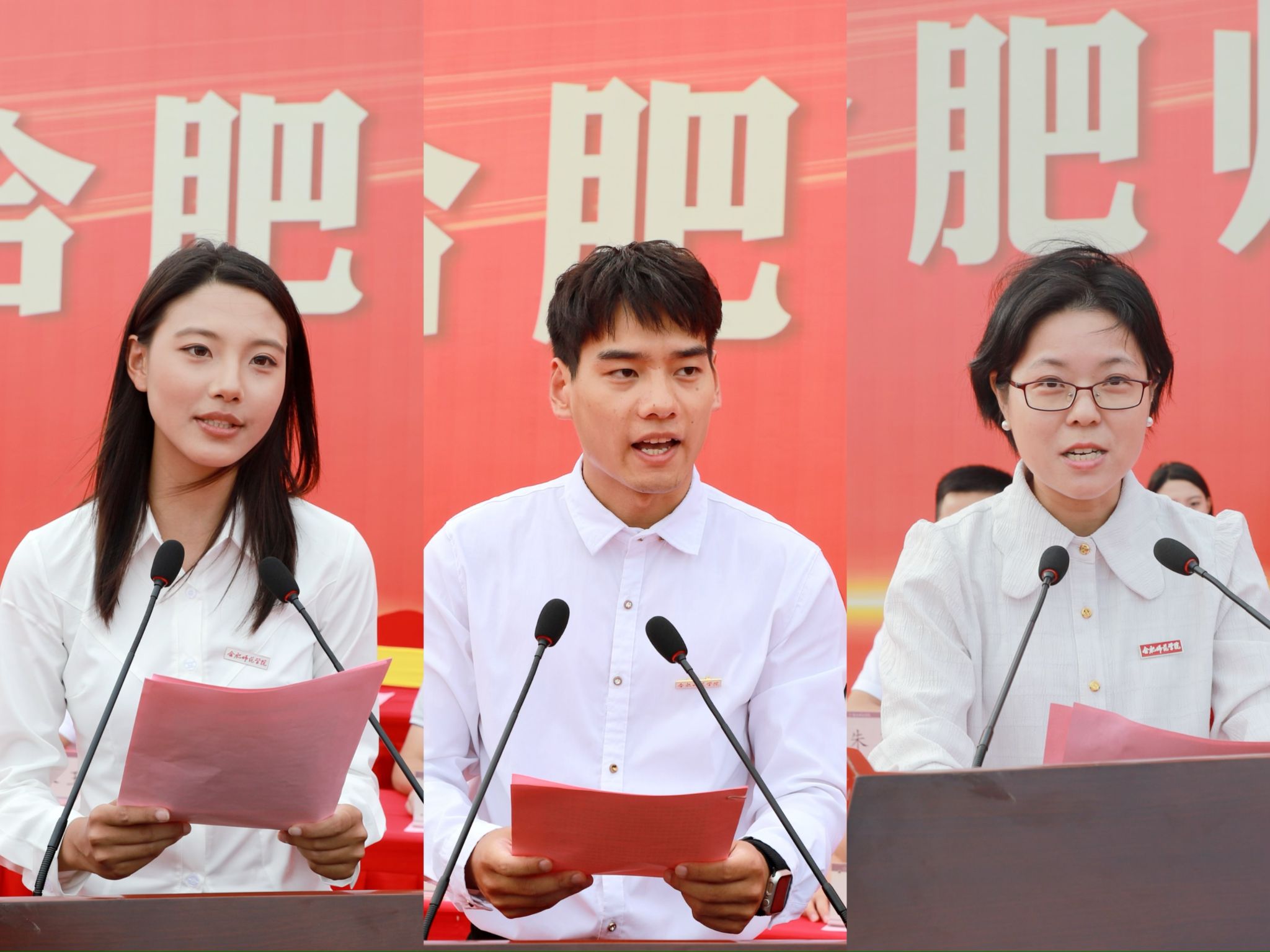 电子信息与集成电路学院孔勐教授、化学与制药工程学院贾震同学、外国语学院夏义婷同学分别作为锦绣校区教师代表、本科新生和研究生老生代表发言。文学院王妍副教授、教育与心理科学学院张辰玥同学、物理与材料工程学院张波涛同学分别作为滨湖校区教师代表、本科新生和研究生老生代表发言。