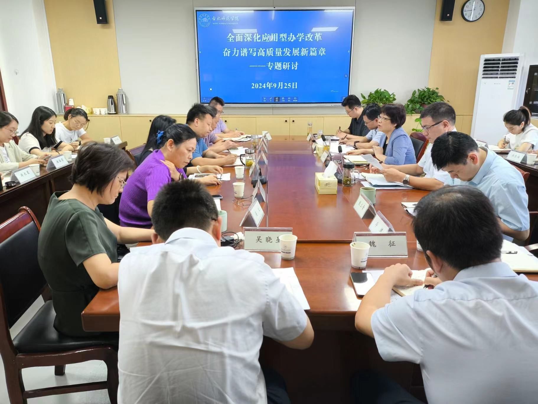 本组讨论参加人员围绕“全面深化应用型办学改革——奋力谱写高质量发展新篇章”这一主题,结合前期大调研成果和各部门工作岗位职责,根据学院创建“应用特色高水平大学”发展方向和建设应用特色高水平大学三步走战略任务,从人才引进、人才培养、滨湖校区建设等多方面做了主题发言并进行了交流讨论。