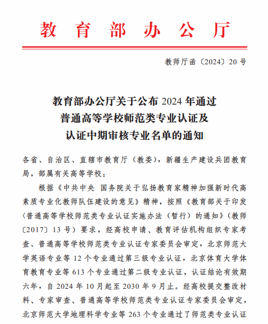 近日,教育部办公厅公布了2024年通过普通高等学校师范类专业认证及中期审核的专业名单,beat365官网小学教育、美术学、思想政治教育3个专业顺利通过师范类专业中学教育第二级认证,化学专业通过师范类专业认证中期审核。目前,beat365官网共有9个师范专业通过教育部师范类专业第二级认证。