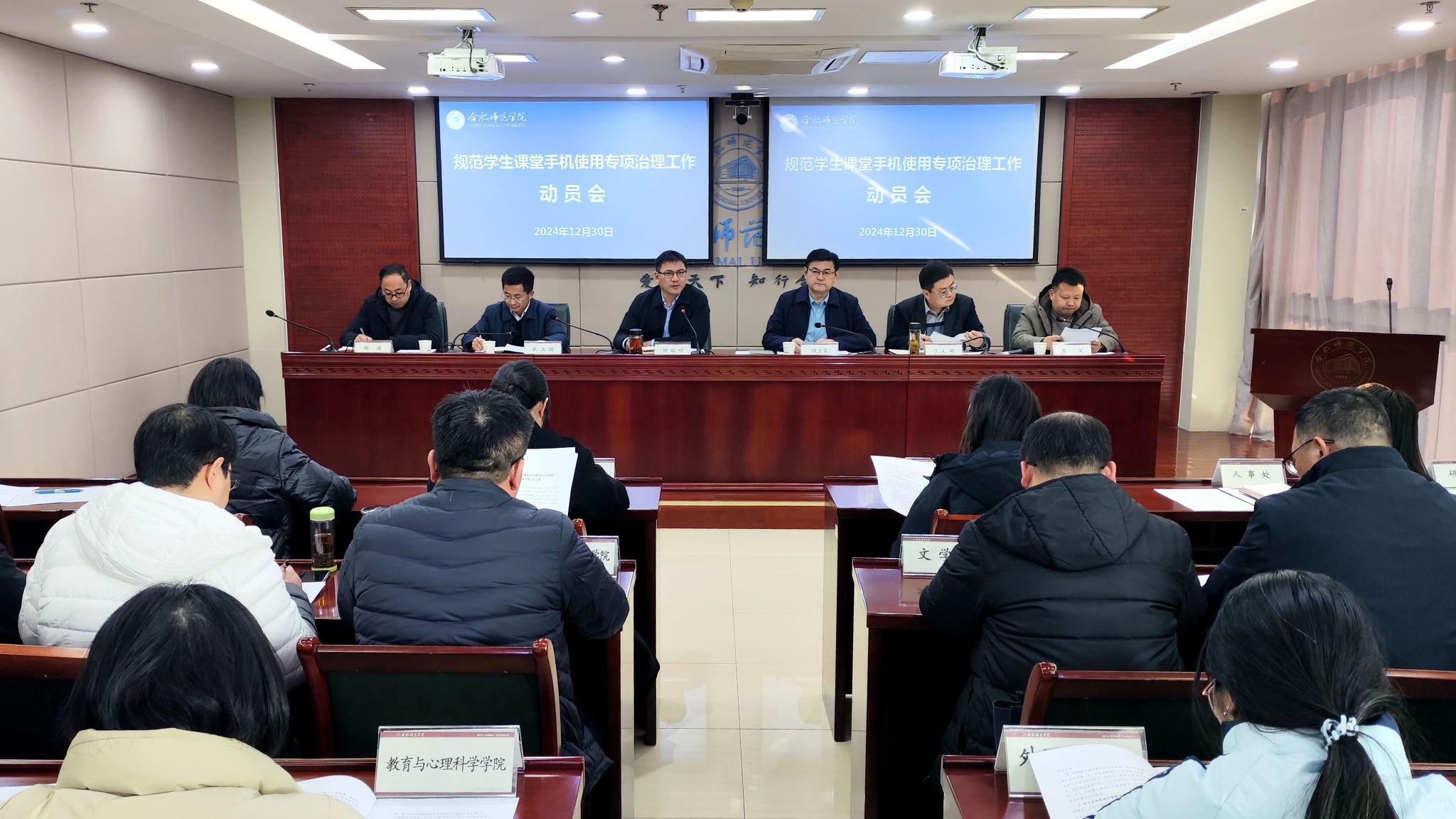 为进一步规范课堂秩序,严肃课堂纪律,保证学生全身心投入学习,切实加强学风建设,营造浓郁的学习氛围,12月30日下午,学院规范学生课堂手机使用专项治理工作动员会在锦绣校区召开。党委委员、副院长周端明,党政办、宣传部、团委、人事处、教务处、研究生处、学生工作处、滨湖校办等职能部门主要负责人,各二级学院院长、党委副书记、副院长以及教师代表、辅导员代表、学生代表等100余人参加了会议。