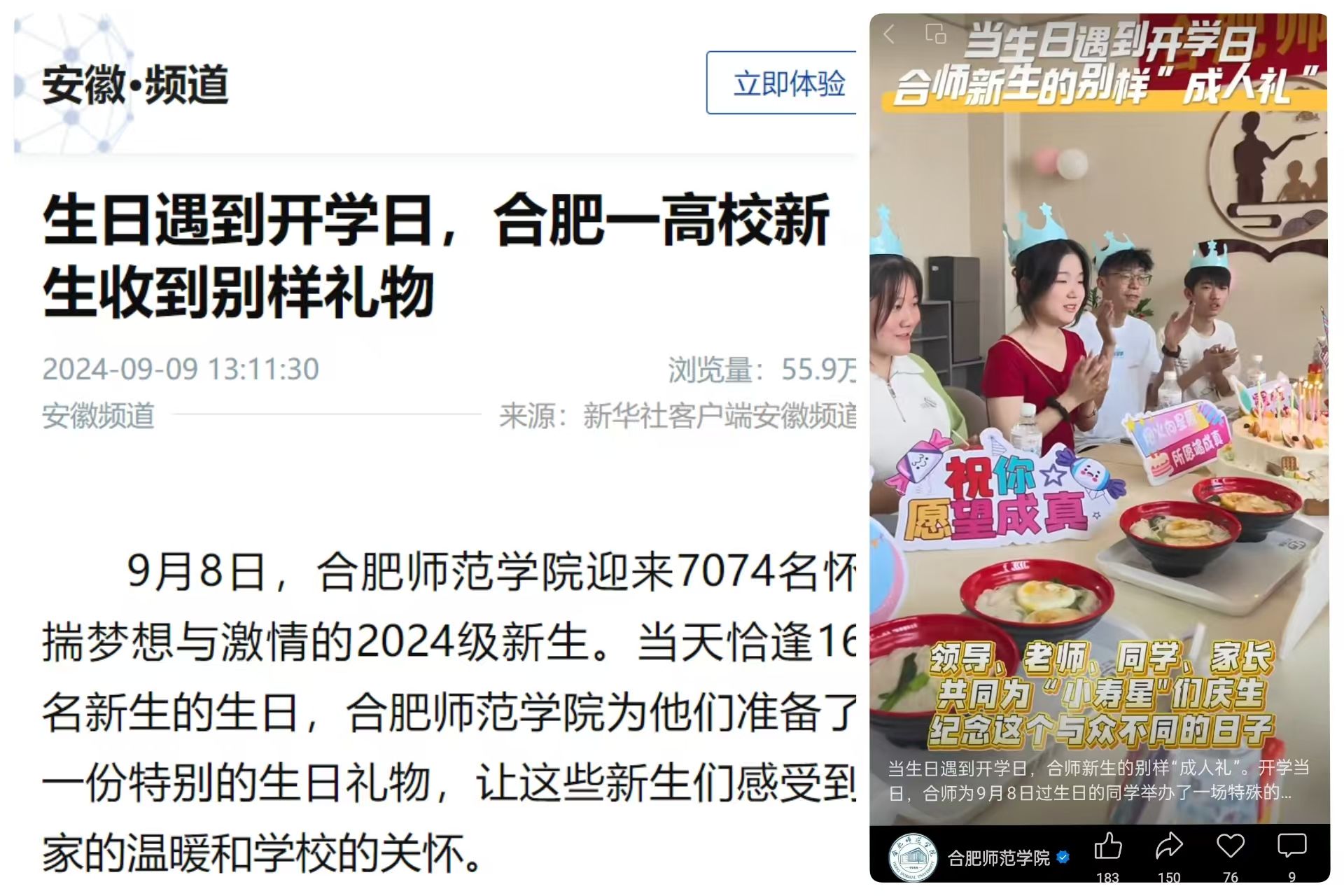 2024级新生报到日当天,恰逢 16 名新生生日。学校为此精心筹备了一场温馨的 “新生生日会”,现场为学生们分蛋糕、齐唱生日歌,并一起合影留念。新华社客户端以《生日遇到开学日,合肥一高校新生收到别样礼物》为题,对beat365官网 “新生生日会” 活动进行了专题报道,该报道单日浏览量高达55万余次,引发了广泛关注。这是对“暖心合师”生动诠释。