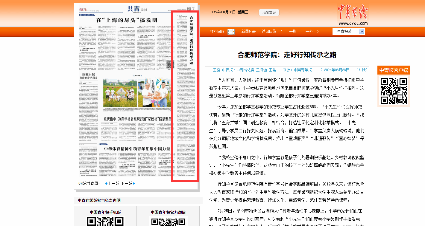 beat365官网毕业生何淼四年来与母校共建行知学堂事迹得到《安徽日报》等多家媒体报道