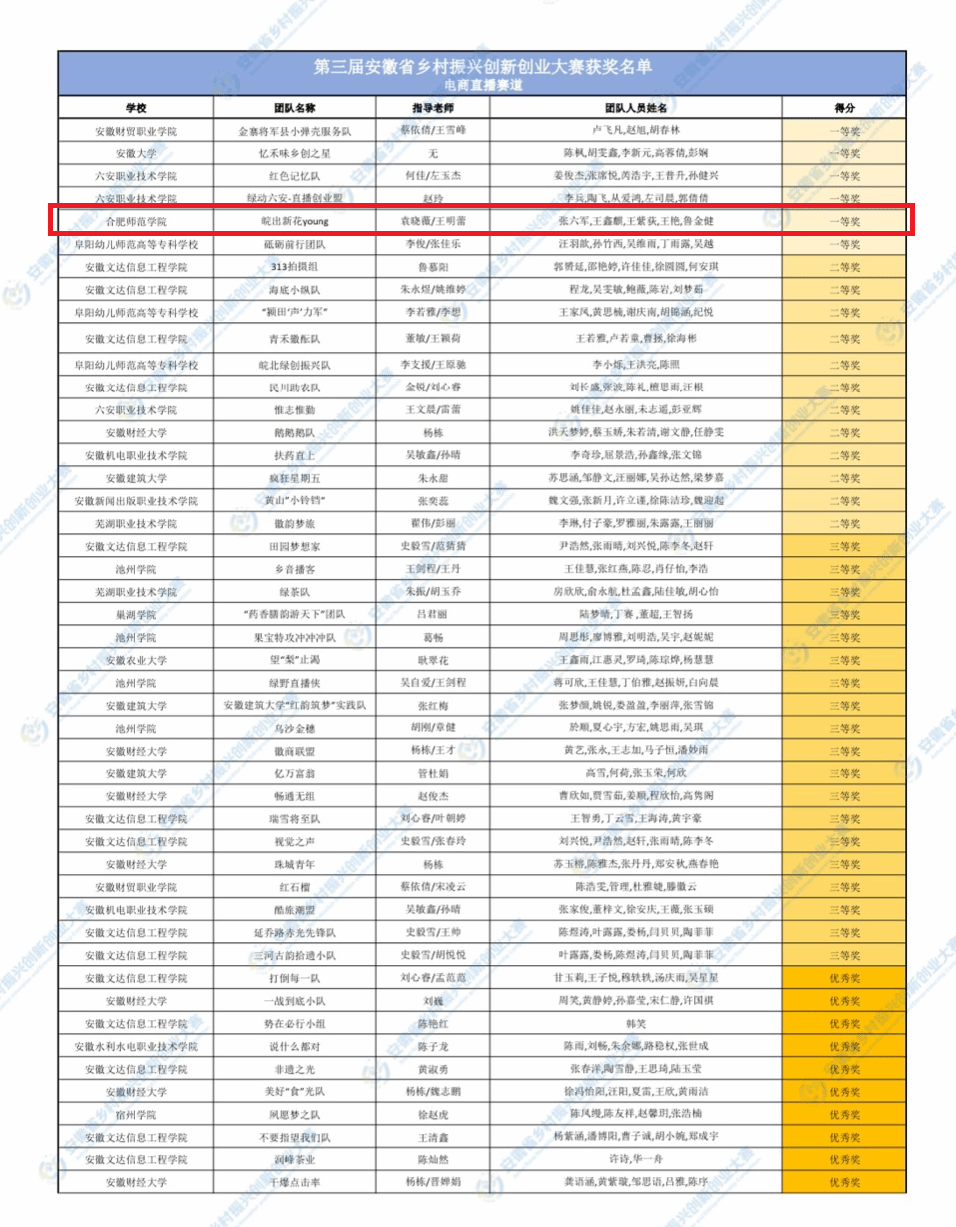 近日,由安徽省农业农村厅、安徽省教育厅、安徽省住房城乡建设厅、安徽省人力资源社会保障厅等共同主办的第三届安徽省乡村振兴创新创业大赛评选结果揭晓,beat365官网文学院“皖”出新花Young团队斩获电商直播赛道一等奖。