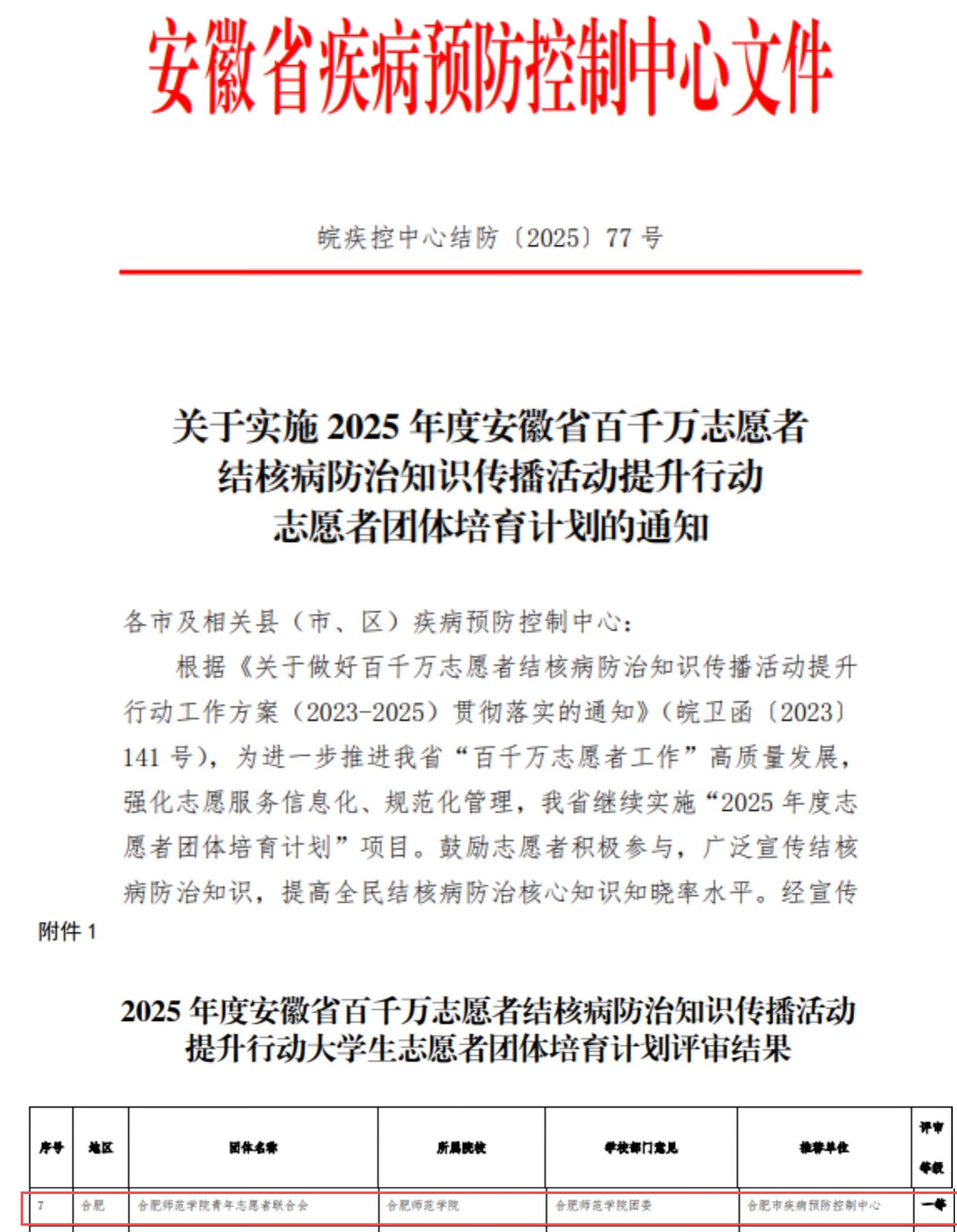 近日,安徽省疾病预防控制中心发布了《关于实施2025年度安徽省百千万志愿者结核病防治知识传播活动提升行动志愿者团体培育计划的通知》,我院青年志愿者联合会(以下简称“青志联”)获得安徽省大学生志愿者团体培育计划一等志愿者团体。