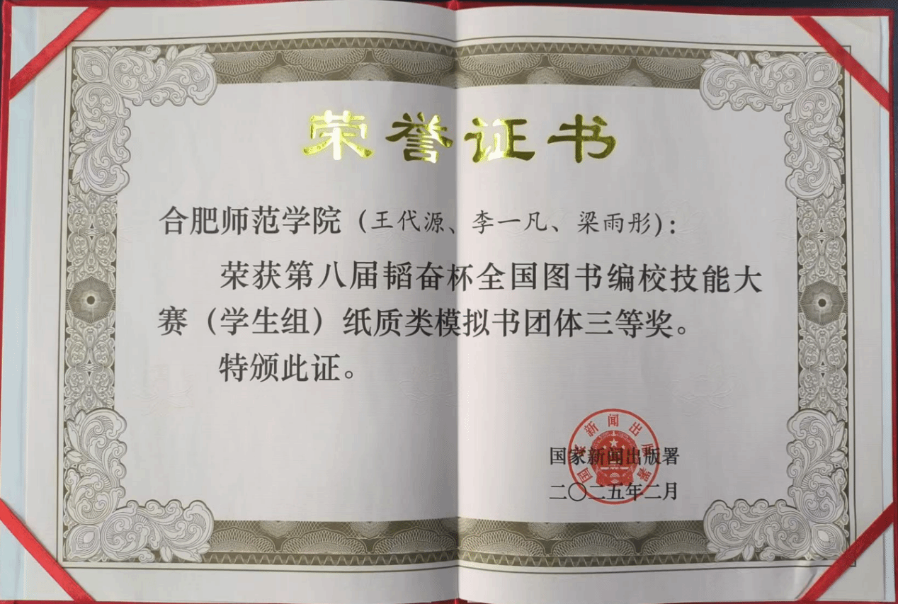 近日,国家新闻出版署发布《关于表彰第八届韬奋杯全国图书编校技能大赛获奖团队和选手的决定》(国新出发〔2025〕1号),公布了第八届韬奋杯全国图书编校技能大赛获奖结果。beat365官网文学院学生王代源、李一凡以及美术与设计学院梁雨彤组成的团队提交的作品《笔梦宣州》从中国传媒大学、武汉大学、南京大学等全国60余所高校、3000余名本科生和研究生、提交的1000余件作品中脱颖而出,荣获大赛学生组纸质模拟书类别三等奖,是本次唯一获奖的安徽省高校。此次获奖也是文学院学子继2020年之后,再次荣获该项赛事的全国三等奖。