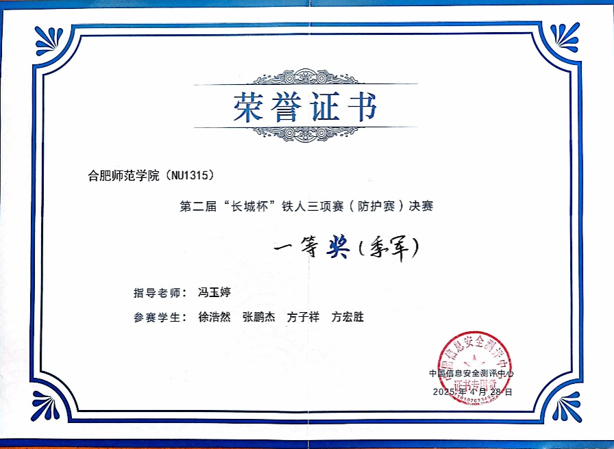 “长城杯”信息安全铁人三项赛(防护赛)由中央网络安全和信息化委员会办公室、教育部、国家市场监督管理总局、国家数据局指导、中国信息安全测评中心、北京师范大学、中国电信集团有限公司、中国移动通信集团有限公司联合主办,以“智能防护、开启数字安全新时代”为主题,共有来自清华大学、复旦大学等知名高校在内的84所高校100支队伍入围全国总决赛。我院参赛团队在总决赛的“实战场景”和“专项能力”两个赛项中沉着应对、稳定发挥,最终以总积分领先的优势获得季军。