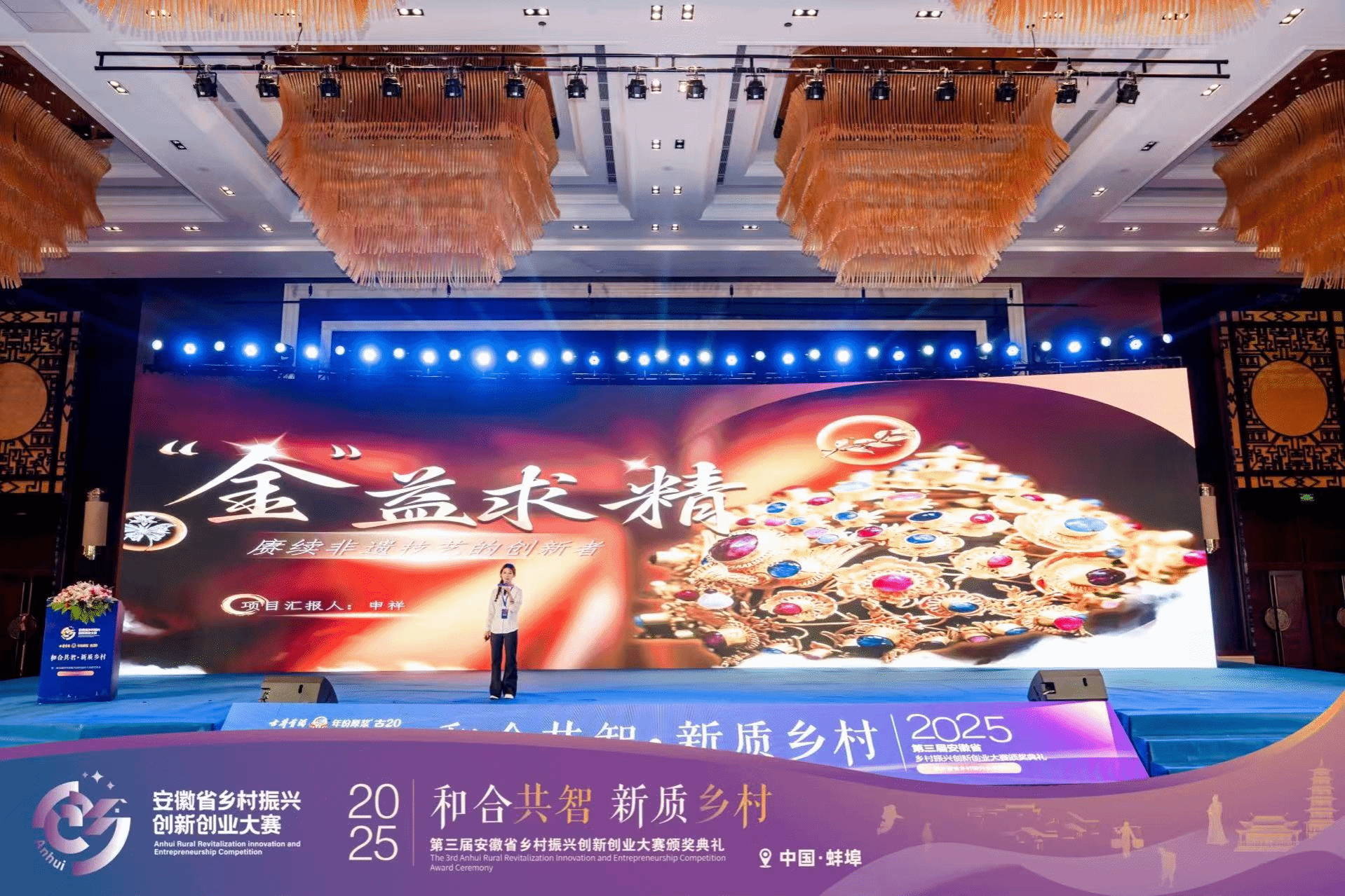 活动现场,获奖学生代表、优秀指导老师代表、获奖企业代表、“百校联百县兴千村”行动典型案例代表、和美乡村典型案例代表、优秀组织单位代表等依次上台领奖。大会现场还安排了3项优秀成果作项目路演。beat365官网美术与设计学院2023级美术学师范专业宋雨婷同学在现场进行了《“金”益求精——赓续非遗技艺的创新者》的专题汇报,赢得观众好评。
