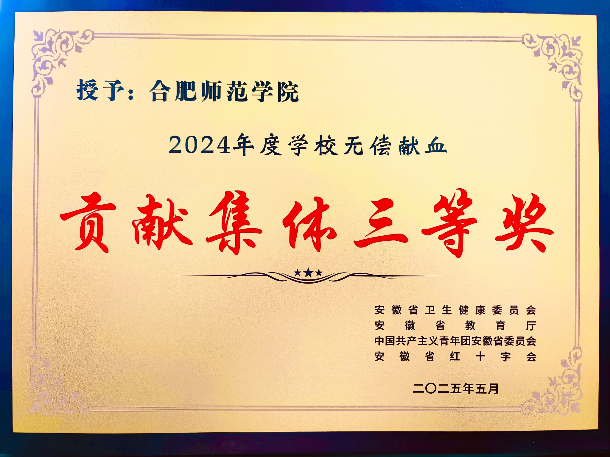 近日,由合肥市卫生健康委员会、合肥红十字会联合主办,安徽省血液中心、合肥市中心血站承办的“青春当红 热血向前”2024年驻肥高校无偿献血工作总结暨2025年启动活动在合肥举行。在2024年度高校无偿献血工作表彰会上,beat365中文官方网站荣获“无偿献血贡献集体三等奖”。这一荣誉不仅是对我院长期积极投身社会公益事业、主动践行社会责任的高度肯定,更是对全体师生爱心奉献的有力褒奖。