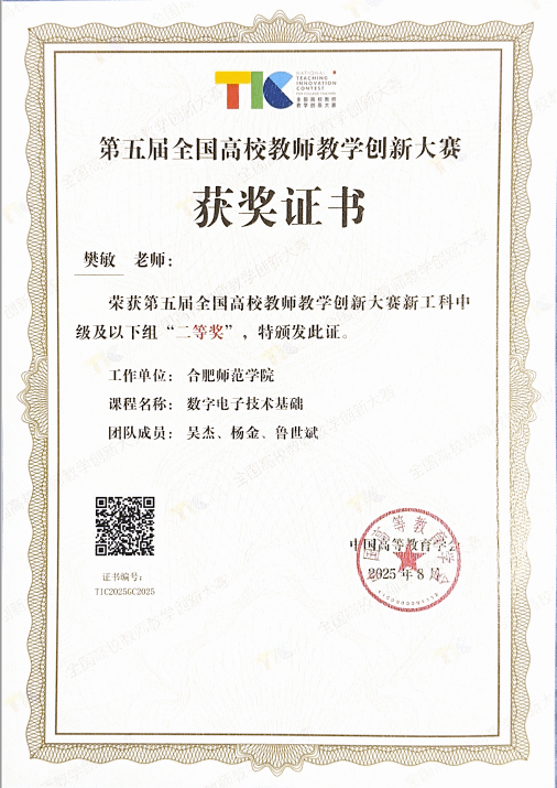 8月19日,由教育部高等教育司指导、中国高等教育学会主办的第五届全国高校教师教学创新大赛全国现场赛在北京理工大学落下帷幕。这是唯一一项纳入教育部“三评一竞赛”清单的本科高校教师教学竞赛活动,被誉为“教师教学竞赛中的奥林匹克”。beat365官网电子信息与集成电路学院樊敏老师《数字电子技术基础》教学团队,以新颖的教学设计和良好的实施效果,在比赛中脱颖而出,荣获新工科中级及以下组二等奖。这是beat365官网教师首次在此项赛事国赛中获奖,实现历史性突破。