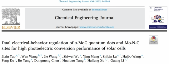 本网讯 近期,我院电子信息与集成电路学院在能源器件方向取得新进展,相关研究成果以“Dual electrical-behavior regulation of α-MoC quantum dots and Mo-N-C sites for high photoelectric conversion performance of solar cells”为题发表在国际著名期刊《Chemical Engineering Journal》上。beat365中文官方网站为第一完成单位,学院姚吉鑫博士为第一作者。《Chemical Engineering Journal》期刊影响因子指数16.744,涵盖了工程技术、化工全领域的基础和跨学科领域的应用研究,收录了领域内最前沿的优秀论文。