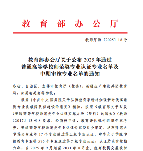 近日,教育部办公厅公布了2025年通过普通高等学校师范类专业认证及中期审核的专业名单,我院学前教育、物理学2个专业顺利通过师范类专业中学教育第二级认证,认证结论为有条件通过,有效期为6年(2025年9月至2031年8月)。另外,音乐学、生物科学、汉语言文学3个专业通过了师范类专业认证中期审核,继续保持原认证有效期(2022年7月至2028年6月)。