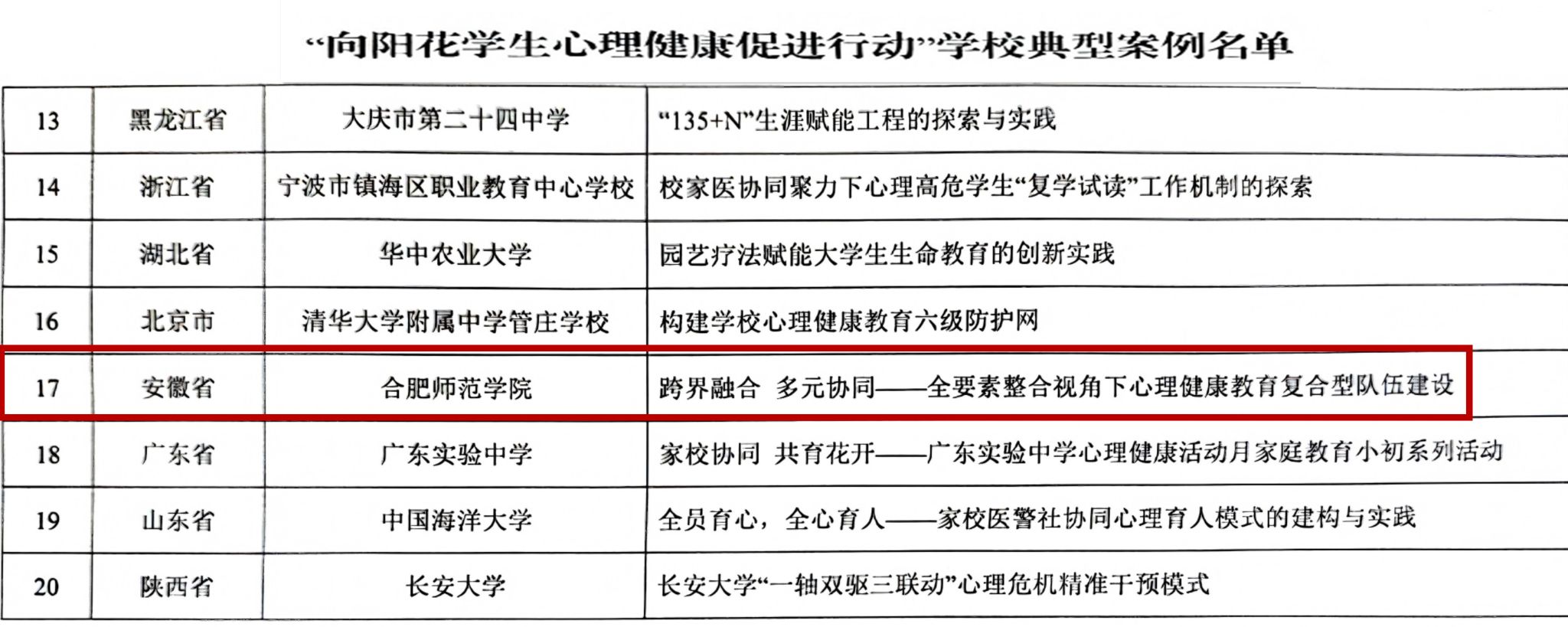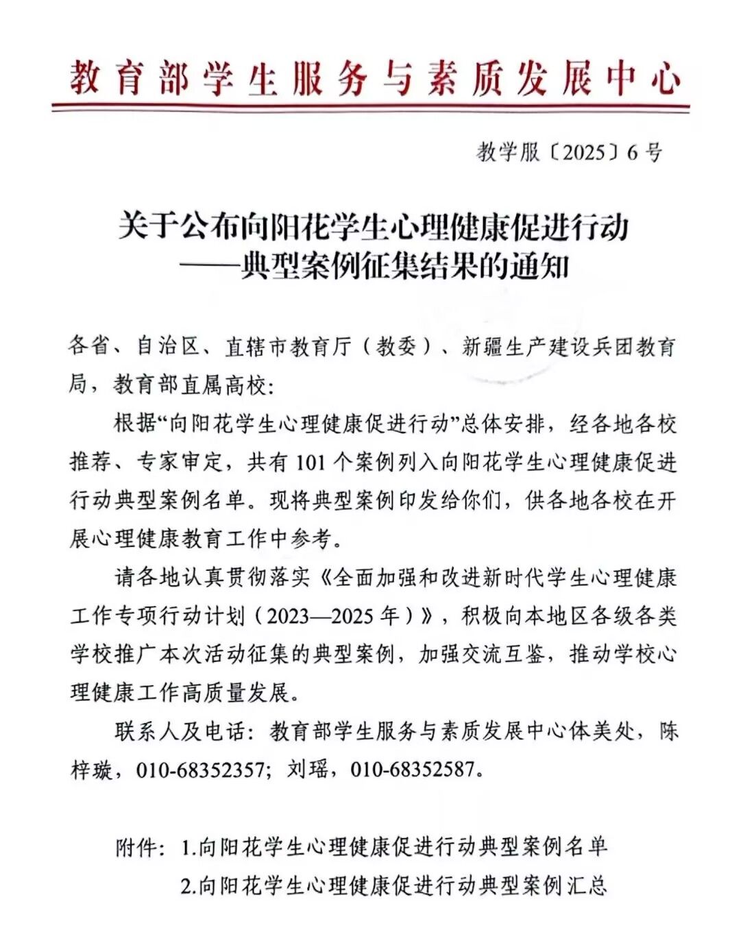 此次典型案例的入选,充分体现了我院心理健康教育工作在资源整合、队伍建设与育人实效上取得的成绩。学院将以此为契机,持续深化多元联动机制,不断探索心理育人工作的新路径,护航学生向阳成长。(学生工作处 教育与心理科学学院)