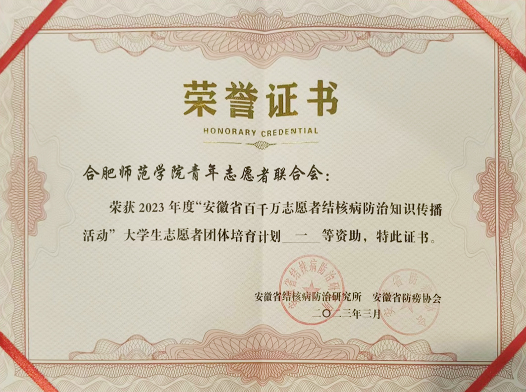 本网讯 近日,安徽省结核病防治研究所、安徽省防痨协会对2023年度“安徽省百千万志愿者结核病防治知识传播活动”大学生志愿者团体培育计划进行表彰,我院青年志愿者联合会荣获一等资助以及安徽省优秀志愿者团体称号。