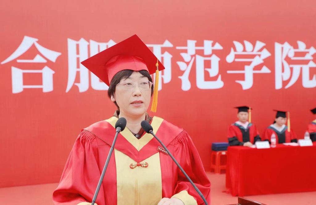 方东玲致辞,她代表学院向毕业生们送上真挚的祝福和美好的祝愿,向倾情陪伴同学们成长的父母亲友、悉心教导同学们成才的全体老师,致以崇高的敬意和衷心的感谢。她回顾了同学们在校期间学院的发展成就,赞扬了同学们所取得的优异成绩,指出,同学们与奋进的合师同风雨、齐奋斗、共担当,用青春实践,为奋进合师增添了一道道夺目的光彩!
