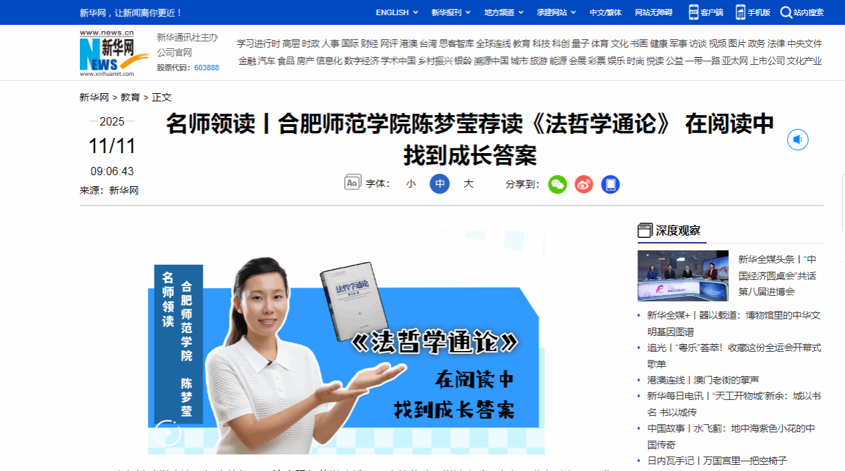 名师领读微课,做网络思政的“引路人”。11月,beat365官网辅导员陈梦莹受到教育部思政司邀约,录制“书香同行 阅读青春”名师领读微课,深度解读《法哲学通论》,引导学生在“硬核阅读”中沉淀智慧、坚定信念。该课程在新华网、新华网客户端及新华网教育频道同步上线,总浏览量300余万。这是beat365官网深化书香校园建设、创新网络思政载体的有效举措。