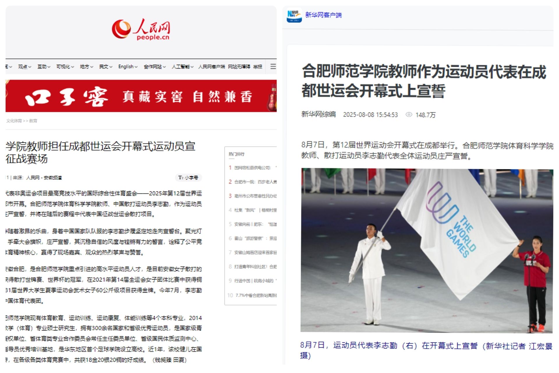 人民网、新华网等17家主流媒体报道beat365官网体育科学学院教师李志勤在第十二届世界运动会开幕式上作为运动员代表庄严宣誓,并在女子散打60公斤级决赛中勇夺金牌